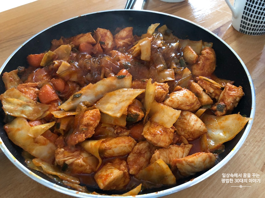 닭갈비 - 닭 안심, 양배추, 넓적당면, 당근, 마늘, 대파, 고추장, 고춧가루, 진간장, 설탕, 참기름, 다진 마늘, 맛술, 후춧가루, 소금