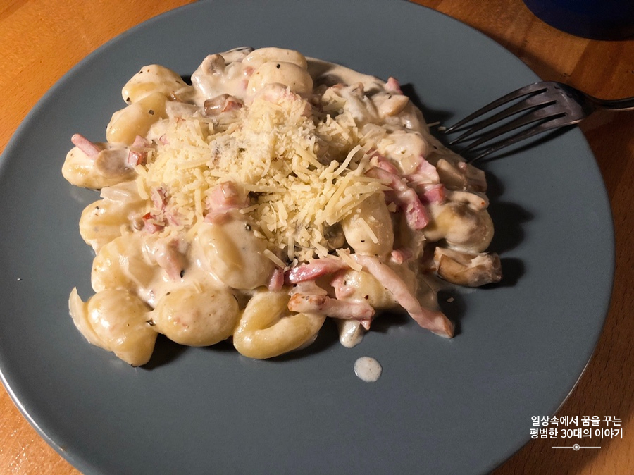 뇨끼 크림 파스타 - 감자 뇨끼, 생크림, 베이컨, 양파, 마늘, 양송이버섯, 후추, 소금, 파슬리, 치즈