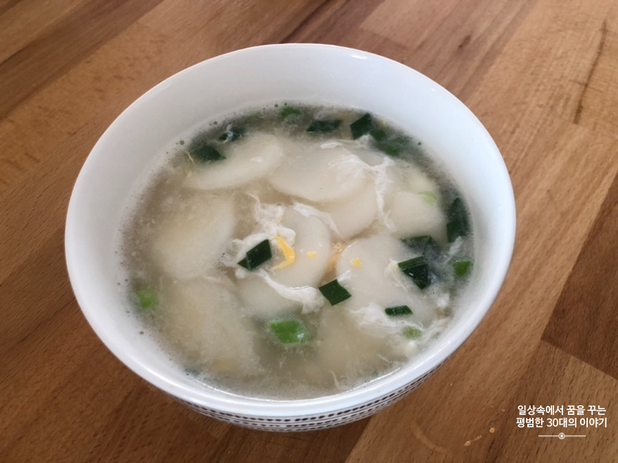 떡국 - 곰국, 떡, 계란, 대파, 후추, 소금