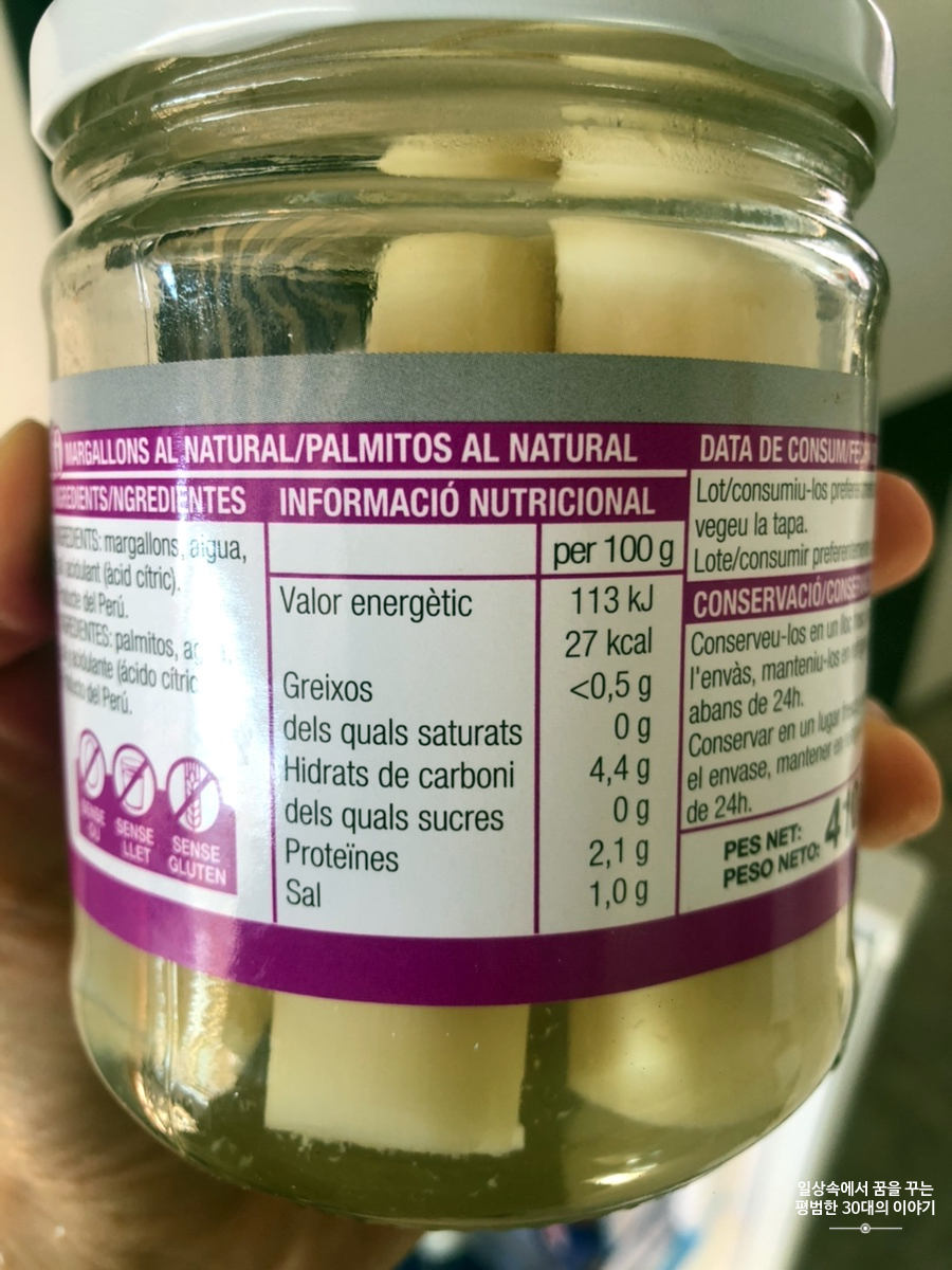 야자심을 처음 접한 건 시댁에서였는데, 이 야자심을 작게 잘라 위에 발사믹 크림소스와 올리브오일을 뿌려 먹거나 샐러드 위에 올려 먹기도 하시더라. 한국에서는 한 번도 보지 못한 식자재라 신기했는데 찾아보니 섬유질, 칼륨, 철, 아연, 인, 구리, 비타민 B2, B6, C, 비타민 B2, 리보플라빈, 칼륨, 칼슘, 마그네슘, 인, 아연, 오메가3 등을 공급하는 식자재로 현재 나에게 필요한 영양분을 모두 포함하고 있다. 이 사실을 알게 된 후, 자주 사 먹고 있다. 한국에서도 팔면 좋으련만 검색해 보니 파는 곳이 거의 없고 가격이 터무니없다. 스페인에서는 400g 넘는 제품 기준으로 €2~2.5 정도 한다. 스페인에 있을 때나 열심히 먹어야겠다.
