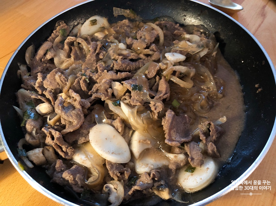 불고기 - 소고기, 양파, 대파, 넓적당면, 떡국떡, 간장, 맛술, 후추, 꿀, 소불고기양념