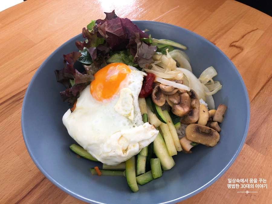 비빔밥 - 햇반, 양파, 당근, 애호박, 양송이버섯, 상추, 고추장, 참기름, 계란, 소금