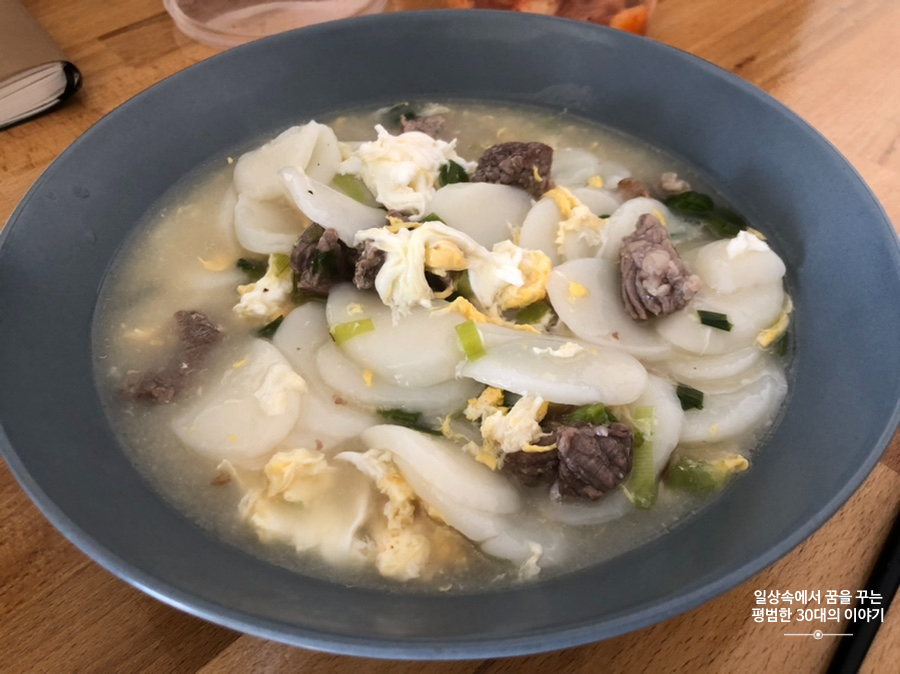 떡국 - 곰국, 떡, 국거리용 소고기, 대파, 참기름, 계란, 후추, 소금