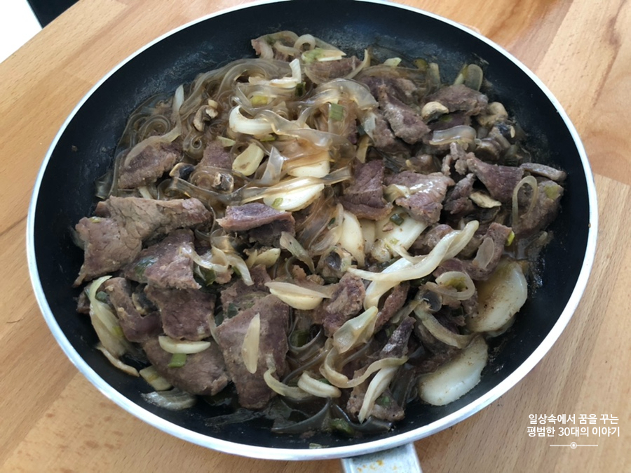 불고기 - 불고기용 소고기, 양파, 대파, 소불고기 소스, 간장, 꿀, 떡국 떡, 넓적 당면, 마늘