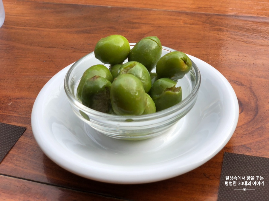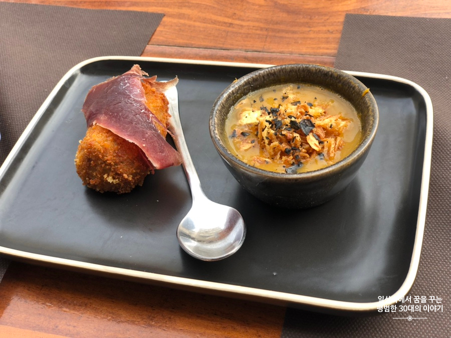 메뉴가 나오기 전, 올리브가 제공됐는데 스페인에서 살면서 올리브의 매력에 빠진 듯! 올리브 종류도 어마어마하게 많고 맛도 다 달라서 골라 먹는 재미가 있다. 한국 가면 쿠팡에서 올리브 직구 열심히 하게 될 듯하다. 애피타이저는 무척 조그마한 접시에 크로케타 1개와 간장 종지만 한 그릇에 수프가 나왔다. 맛은 있었는데 양이 적어도 너무 적은 게 아닌가. 뭐... 애피타이저니까 간단하게 먹는 게 맞긴 하지 싶으면서도 아쉬운 마음이 드는 건 어쩔 수 없는 듯.