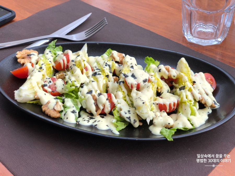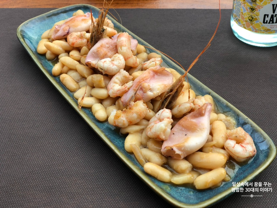 첫 번째 메뉴 중 Guiso de alubias con calamarcitos y gamba를 연신 감탄하면서 먹었는데 무엇보다 오징어가 무척 신선하고 맛있었고 콩 스튜를 해산물 육수를 베이스로 해서 만든 건지 깊은 감칠맛이 났다. 내가 상상해 보지 못했던 그런 맛이라서 더 좋았던 것 같다. 샐러드는 상상했던 그 맛!