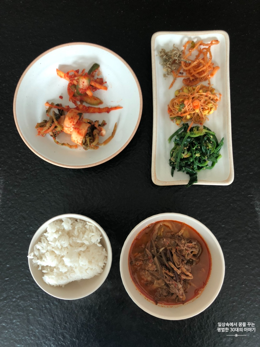 메뉴: 나(육개장, 알타리 김치, 도라지 무침, 진미채, 멸치, 콩나물 무침, 시금치 나물), 남편(우유, 오레오)