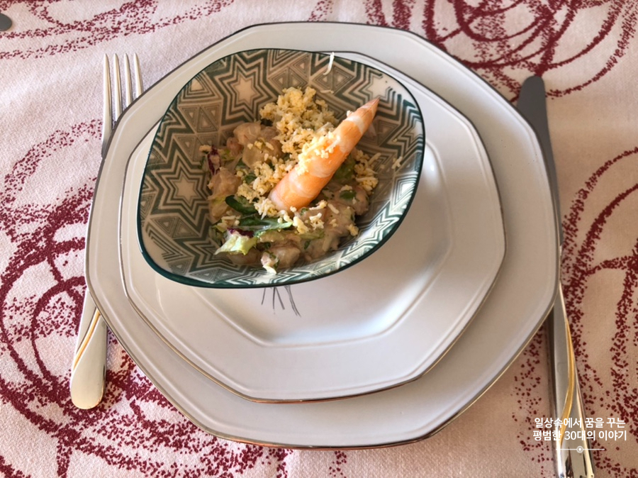 점심: 시댁찬스 / 새우 샐러드, 푸아그라, 새우구이, 장어 파스타, 뽈뽀