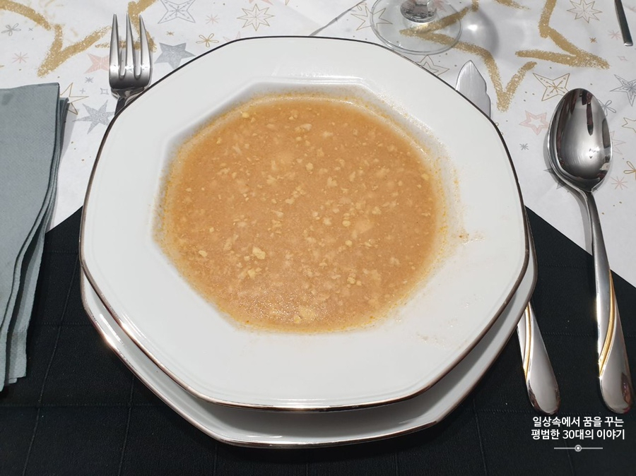 메뉴: 시댁찬스 / 연어, 푸아그라, 비스킷, 해산물 수프, 빠에야, 청포도