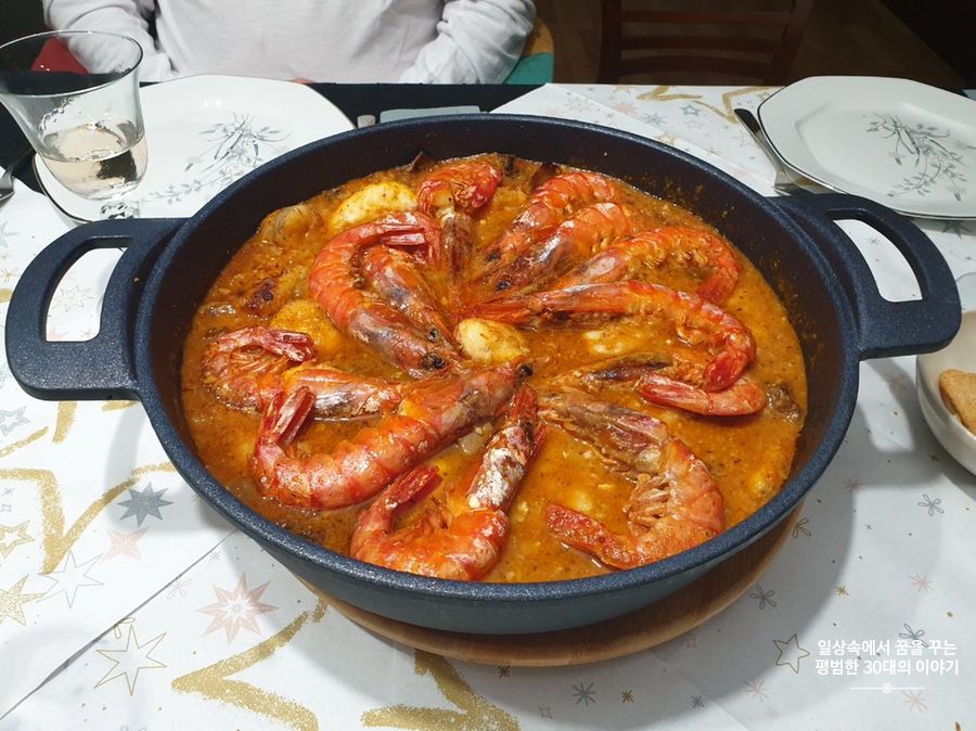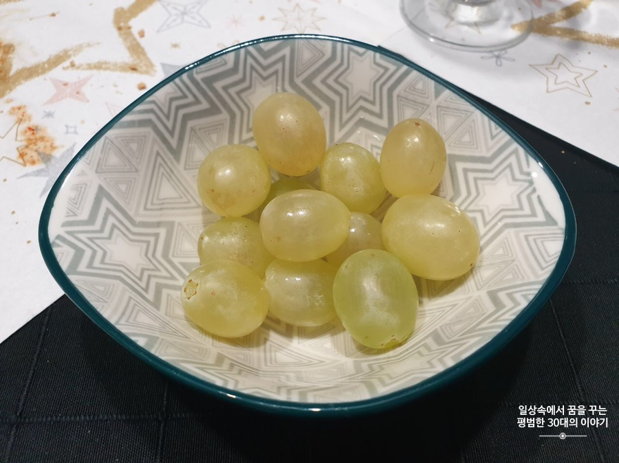 저녁: 시댁찬스 / 연어, 푸아그라, 비스킷, 해산물 수프, 빠에야, 청포도 |