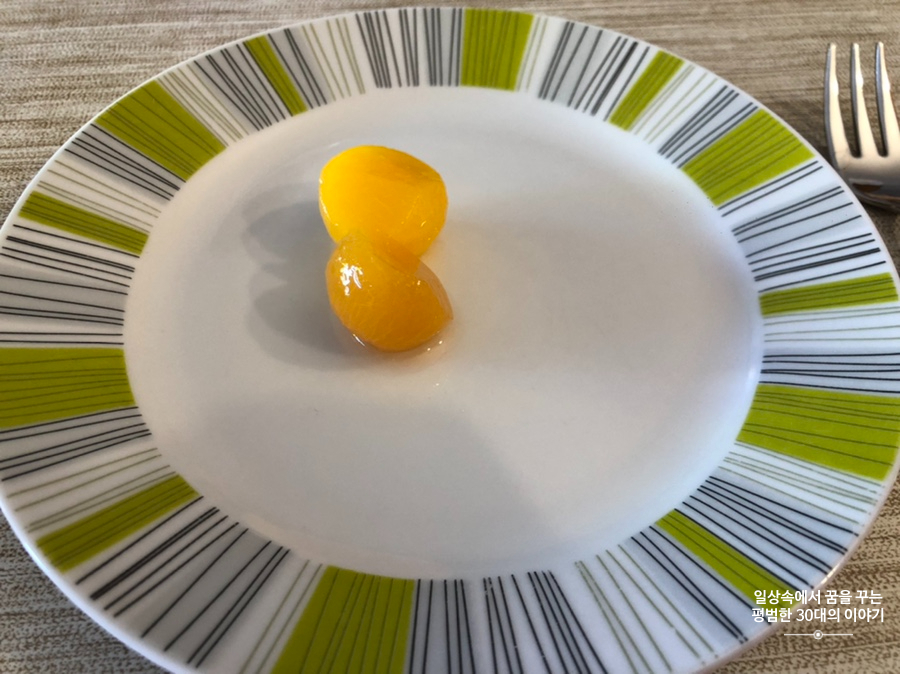 점심: 시댁찬스 / 아스파라거스 샐러드, 감자볶음, 복숭아 통조림