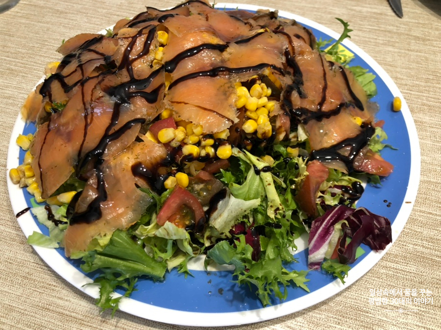 메뉴: 시댁찬스 / 연어샐러드, 푸에트, 드라이 소세지, 마카로니