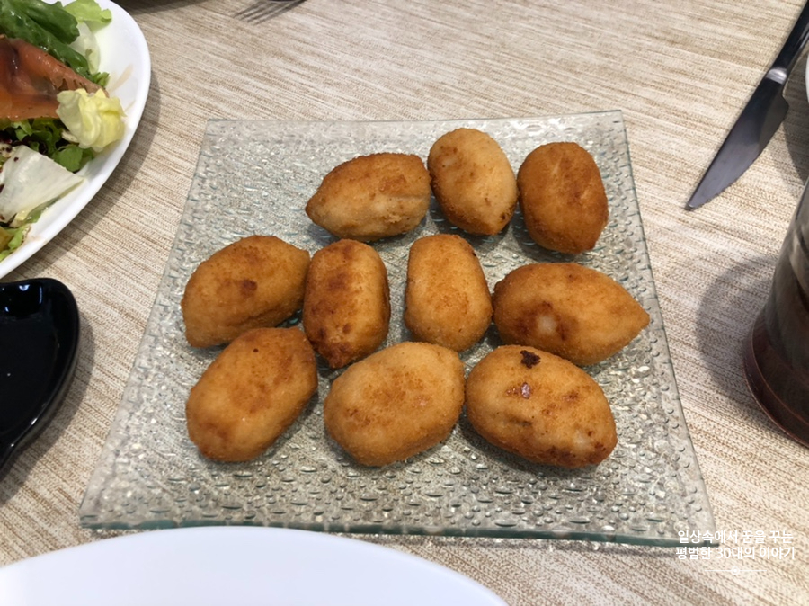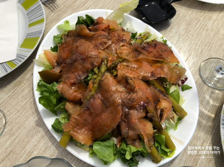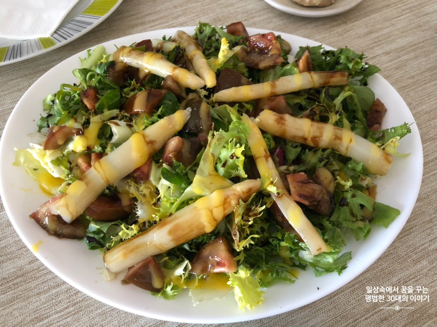 점심: 시댁찬스 / 아스파라거스 샐러드, 보께론, 블랙올리브, 연어샐러드, 뽈뽀 크로케타, 양파 수프, 토마토 새우 구이, 롤케이크