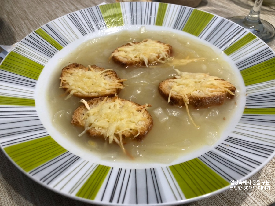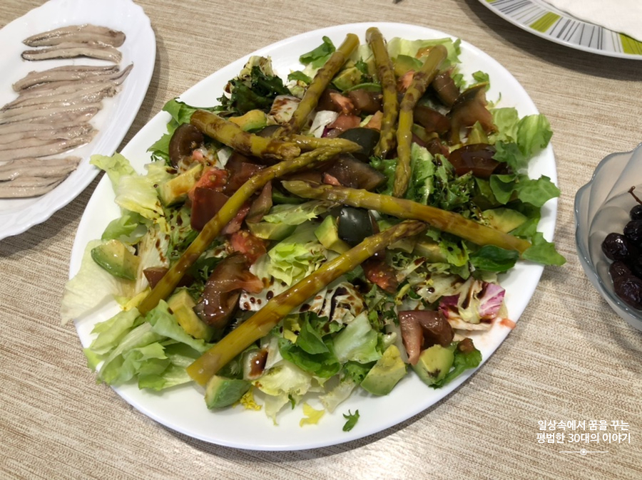 메뉴: 시댁찬스 / 아스파라거스 샐러드, 보께론, 블랙올리브, 연어샐러드, 뽈뽀 크로케타, 양파 수프, 토마토 새우 구이, 롤케이크