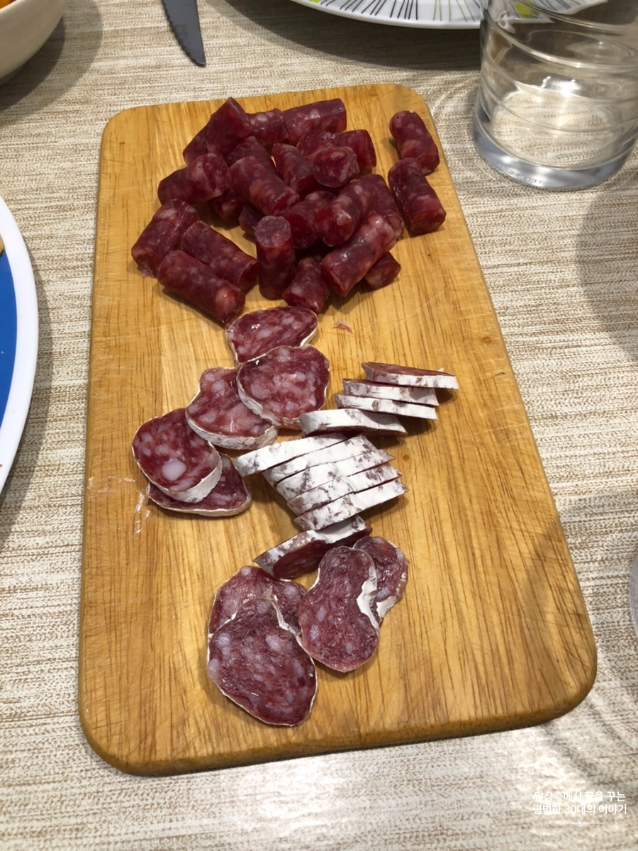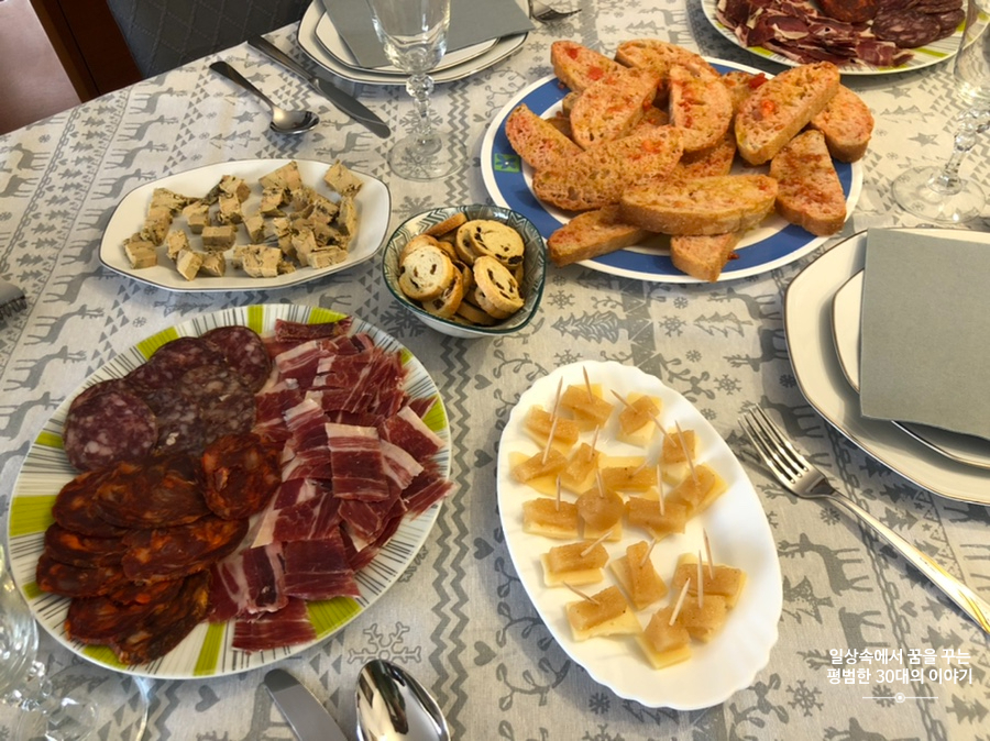 점심: 시댁찬스 / 빵꼰또마떼, 비스킷, 푸아그라, 하몽, 초리소, 살치촌, 치즈 with 살구잼, 미트볼 파스타 수프, 트러플 까날로니, 과일 케이크