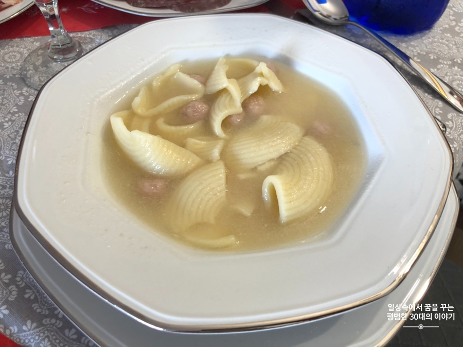 점심: 시댁 찬스 / 푸아그라, 치즈 with 살구잼, 하몽, 살치촌, 초리소, 비스킷, 감자 양갈비 구이, 미트볼 파스타 수프