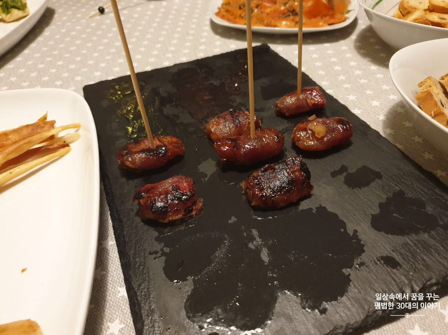 메뉴: 시댁 찬스 / 하몽, 베이컨말이구이, 연어 크림치즈 비스킷, 크로케타