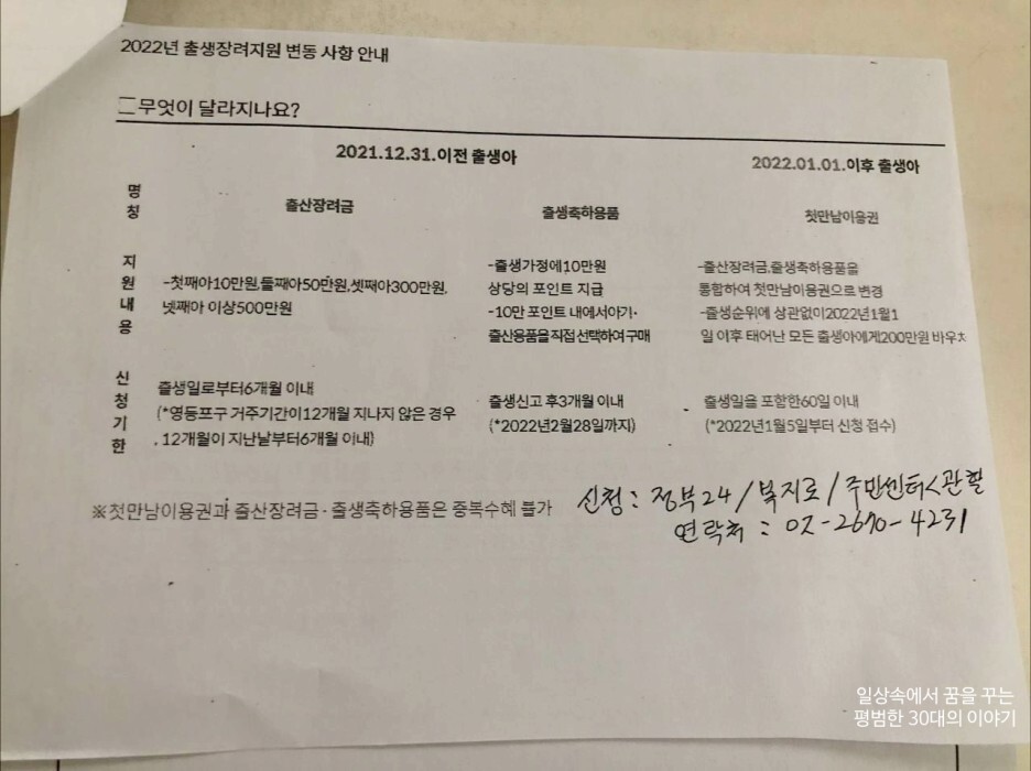 - 첫 만남 이용권(2022년 1월 1일 이후 태어난 모든 출생아에게 200만 원 바우처/출생일을 포함한 60일 이내 신청/정부 24, 복지로, 관할 주민센터에서 신청)