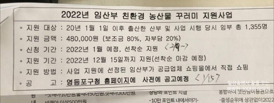 - 2022년 임산부 친환경 농산물 꾸러미 지원 사업(지역마다 신청일이 다른데 영등포구는 2/9 신청)