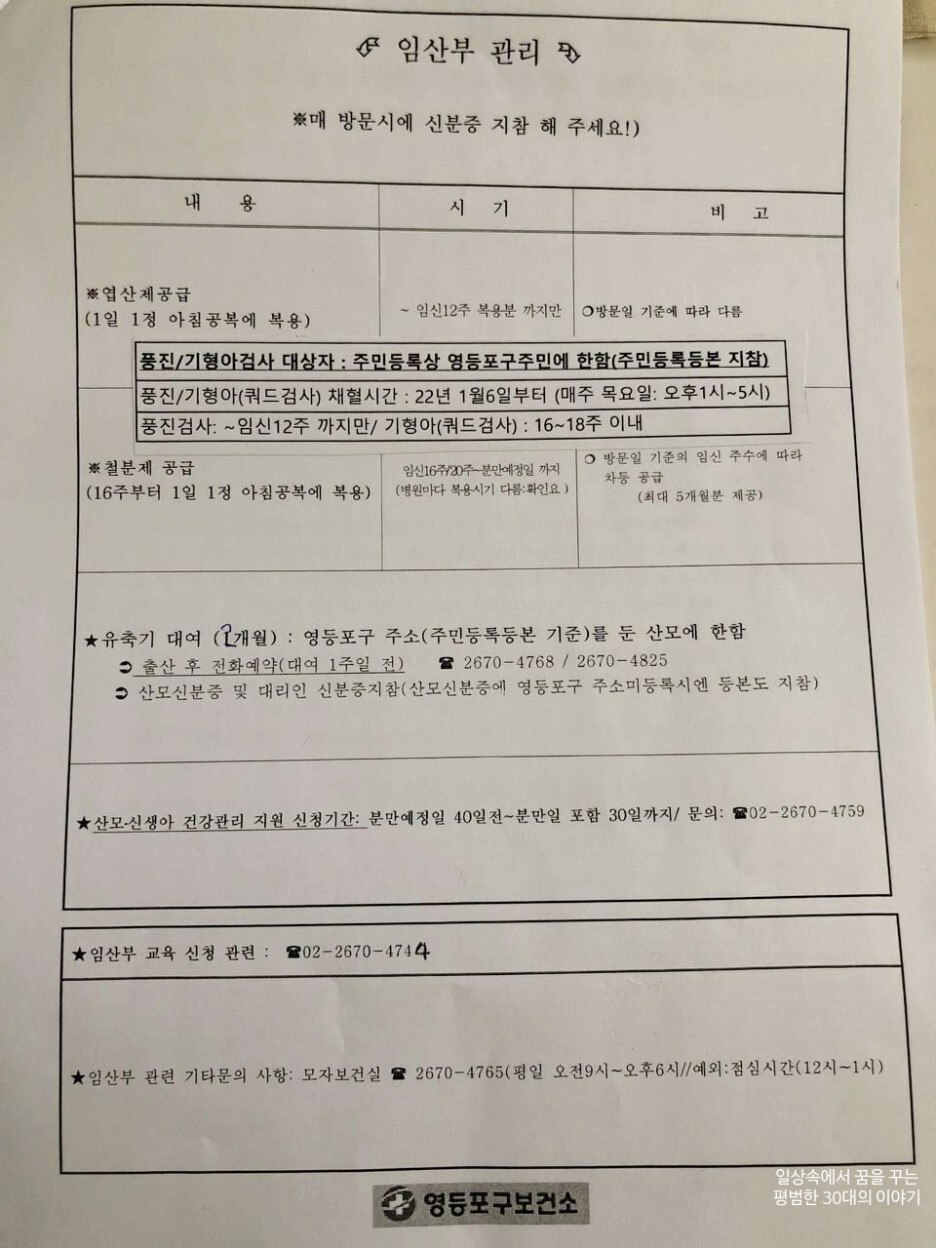 - 풍진(임신 12주까지만)/기형아(쿼드/16~18주 이내) 검사(채혈 시간: 22년 1월 6일부터 매주 목요일 오후 1시~5시/주민등록상 영등포구 주민에 한함/주민등록등본 지참)