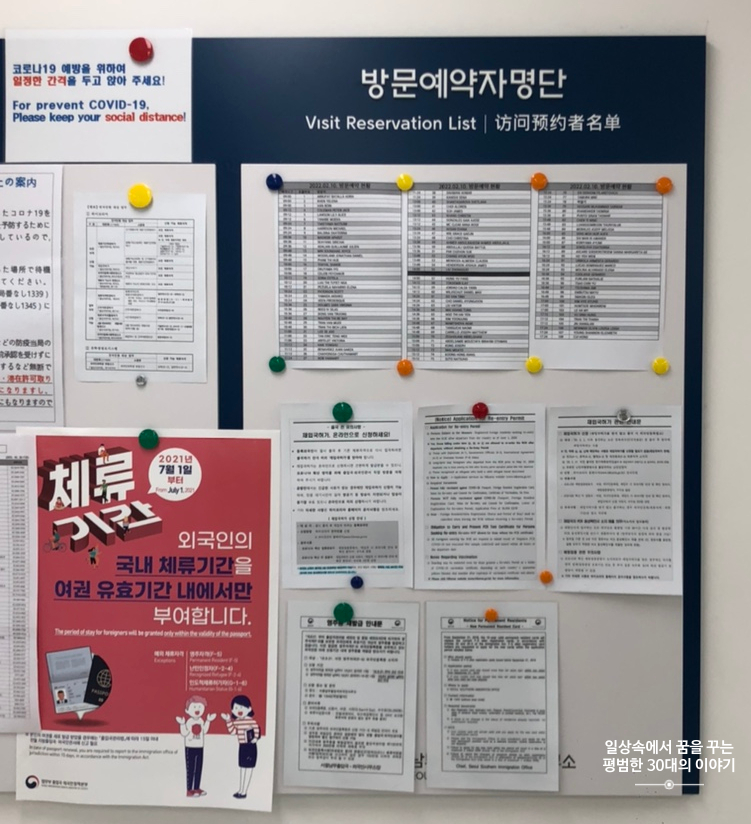짝꿍의 관찰 출입국 외국인청인 서울남부 출입국외국인 사무소에(5호선 마곡역 1번 출구에 위치) 도착하자마자 한 일은, 1층에 있는 수입인지 사무소에서 수입인지 3만 원 내고 받기! 그리고서 2층으로 올라가서(1층은 중국 / 2층은 중국 외 국적) 벽면에 게시되어 있는 예약자 명단을 확인한 후, 순서가 되길 기다리면 되는데 우리는 1번이라 9시 딱 되자마자 바로 우리 차례. 우리는 F6 비자 연장이라 그런 지 15분 만에 모든 업무를 마칠 수 있었다. 원래 가지고 있던 외국인 등록증 뒷면에 날짜만 추가로 기재해 줬다. 그리고 역시나 임신확인서의 도움을 받아 올해는 2년 연장을 받을 수 있었다. 혹시 몰라서 임신확인서를 가져왔다고 담당자에게 말하니, 담당자가 서류 심사하는 데 도움이 된다고 하더라. 다음번엔 3년 받을 수 있으면 좋겠지만 2년 받은 것만으로도 무척 만족!