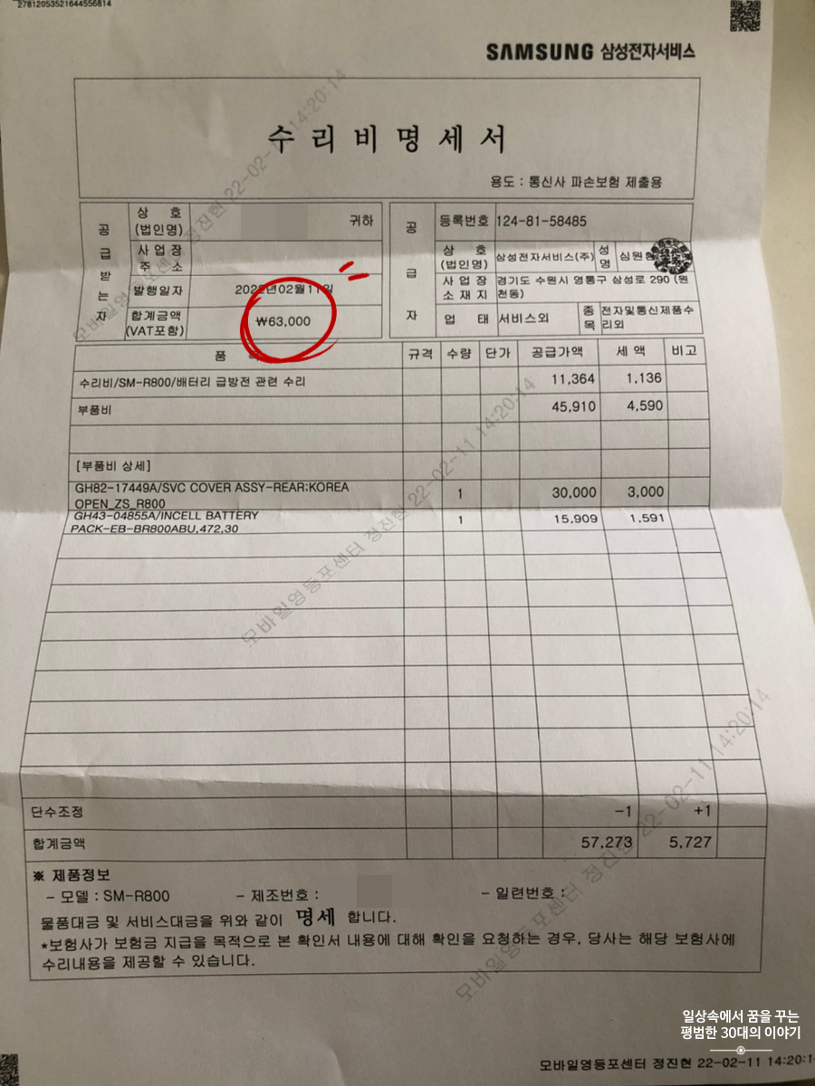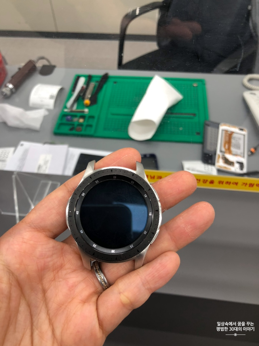 짝꿍에게 3년전 생일선물로 사준 갤럭시 워치 SM-R800 배터리가 처음 샀을 때는 일주일 가더니 이제는 이틀이면 충전을 해야할 정도로 상태가 악화되어서 배터리 교체를 하기 위해 삼성 서비스 영등포센터를 찾았다. 내가 방문한 삼성 서비스 영등포센터에는 당일에 배터리 재고가 없어 다음 날 다시 방문하였다. 방문하기 전에 지금 사용하고 있는 스트랩이 정품이 아니고 분리가 어려워 미리 분리를 해서 가지고 와달라고 직원분이 말씀하셔서 스트랩을 아예 분리해서 가져갔다. 배터리 교체하는데 걸린 시간은 15분 정도였고 비용은 63000원! 배터리만 교체하면 20000원대로 저렴하지만 교체 후, 방수기능이 떨어질 수 있다고 한다. 24시간 365일 갤럭시 워치를 사용하는 남편에게 갤럭시 워치의 방수기능은 필수였기 때문에 뒷판 자체를 아예 교환해서 방수기능이 떨어지지 않도록 했다. 앞으로 3~4년은 더 잘 쓰기를!