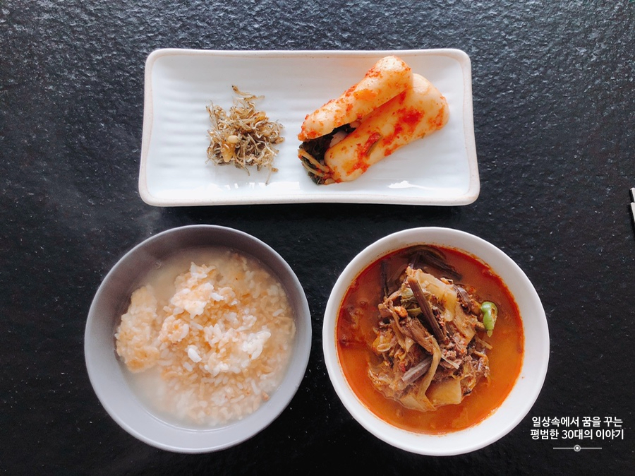메뉴: 멸치볶음, 알타리김치, 누룽지, 육개장