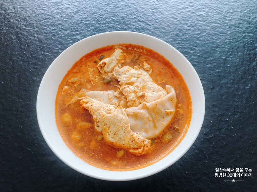 매콤 만둣국 - 곰국, 고추장, 다진마늘, 대파, 계란, 만두, 청양고추