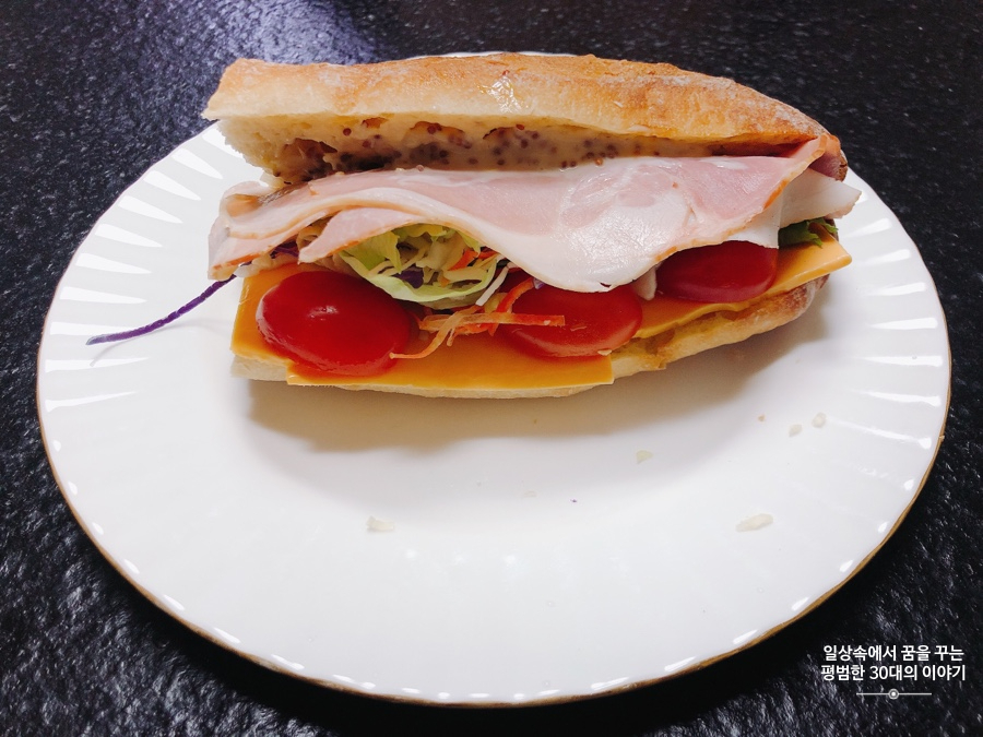 바게트 샌드위치 - 바게트, 잠봉, 샐러드 야채, 치즈, 방울토마토, 마요네즈, 꿀, 홀머스터드
