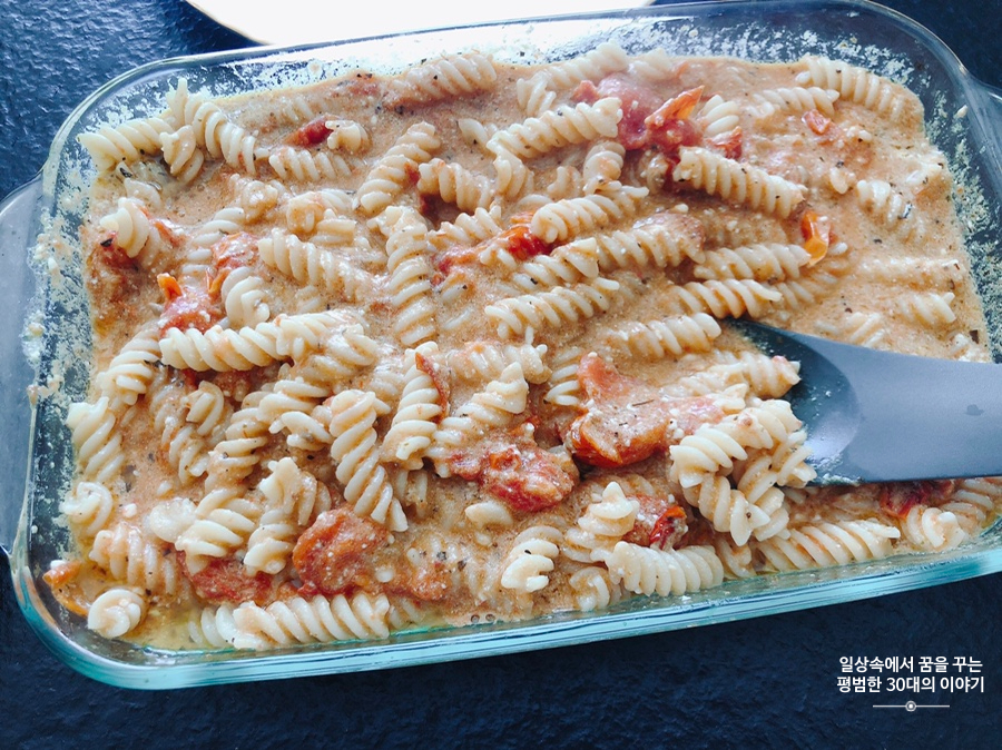 페타치즈 파스타 - 페타치즈, 방울토마토, 페스토소스, 올리브오일, 다진 마늘, 소금, 파스타면, 홀토마토