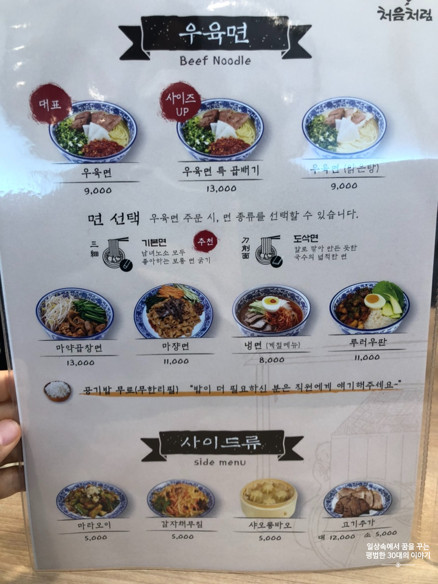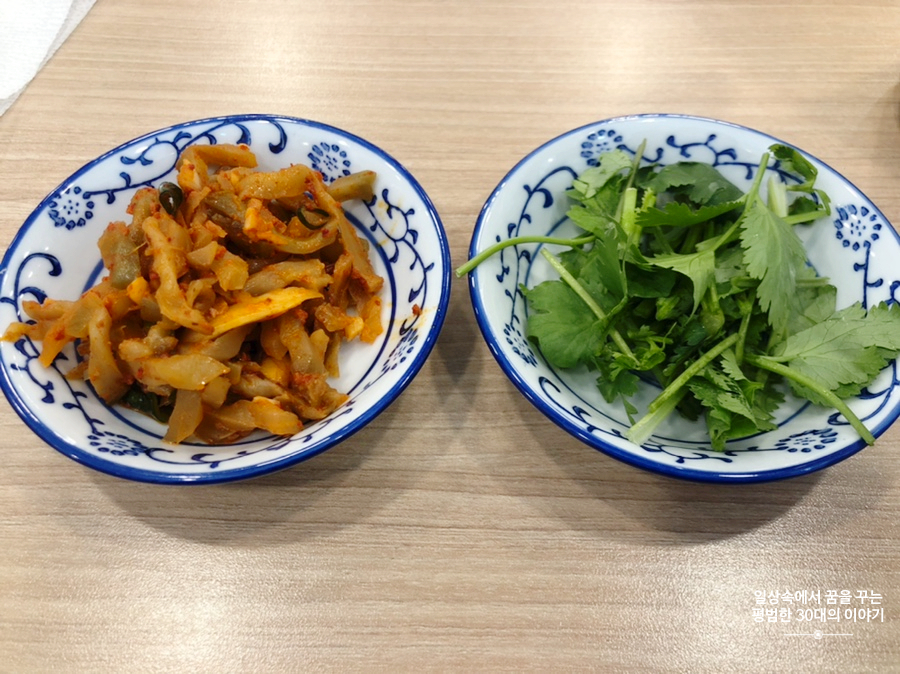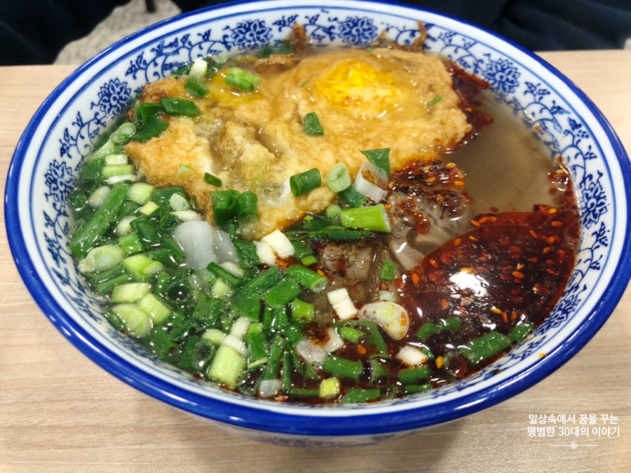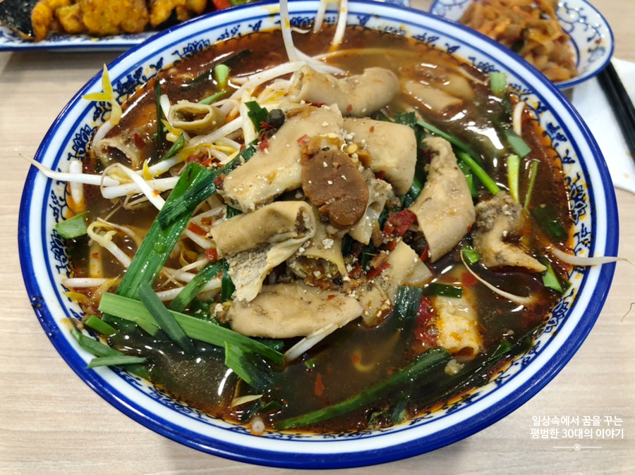 우리는 둘이서 우육면(9000원), 마약곱창면(13000원) 그리고 가지탕수 중사이즈(9000원)를 주문했다. 기본반찬으로는 짜사이와 고수가 나오고 가장 먼저 가지탕수 중사이즈가 나왔다. 바삭하며 촉촉한 가지탕수는 언제나 옳다! 특별하게 다른 곳보다 맛있지는 않지만 그래도 평타 이상으로 맛있었다. 그리고 중사이즈 치고는 양이 꽤 많았다. 그리고 나서 나온 우육면과 마약곱창면. 우육면 위에 특이하게 튀긴듯한 계란후라이와 부드러운 고기가 올려져있었다. 마약곱창면에는 곱창과 숙주가 듬뿍 들어있어 있었다. 곱창은 내 입맛에는 살짝 아쉬운 맛이었다. 내가 워낙 마라탕을 좋아하기 때문에 마라의 화한 맛이 나는 마약곱창면 국물이 우육면 국물보다 맛있었다. 그런데 대만식 우육면을 상상하고 갔는데 신장식 우육면이라 내가 상상하던 맛이 아니어서 조금 아쉬웠고 맛이 그다지 특이점이 없고 평범해서 다시 또 방문할 것 같진 않다.
