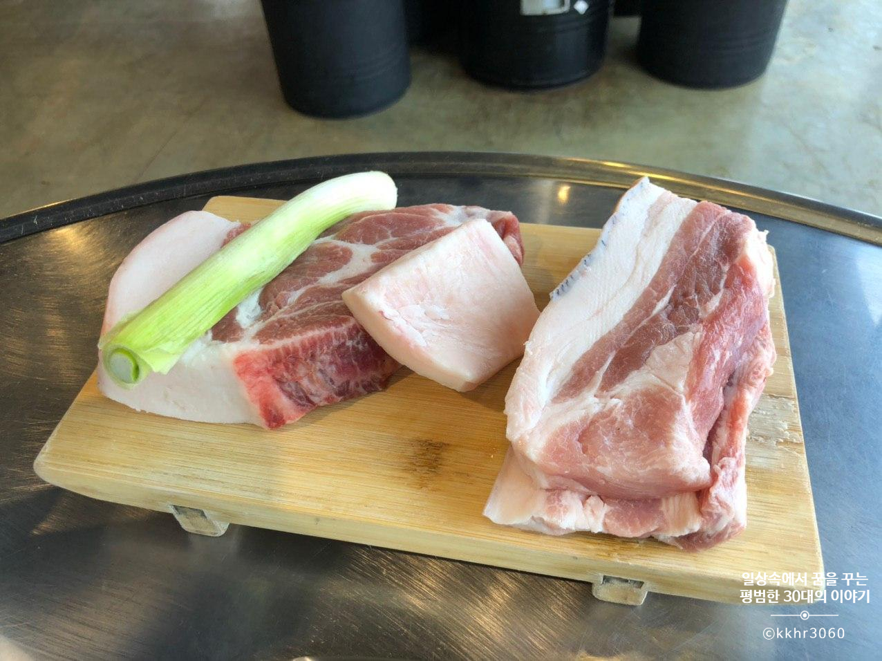 메뉴는 여느 흑돼지 전문점과 다르지 않게 단출하다. 우리는 제주도 흑돼지 근고기 600g(54000원)을 주문했다. 제주도에서 흑돼지 식당을 여러 곳 가봤는데 중량도 가격대도 대부분 비슷하다. 둘이서 600g 이면 충분히 배부르게 먹을 수 있다.