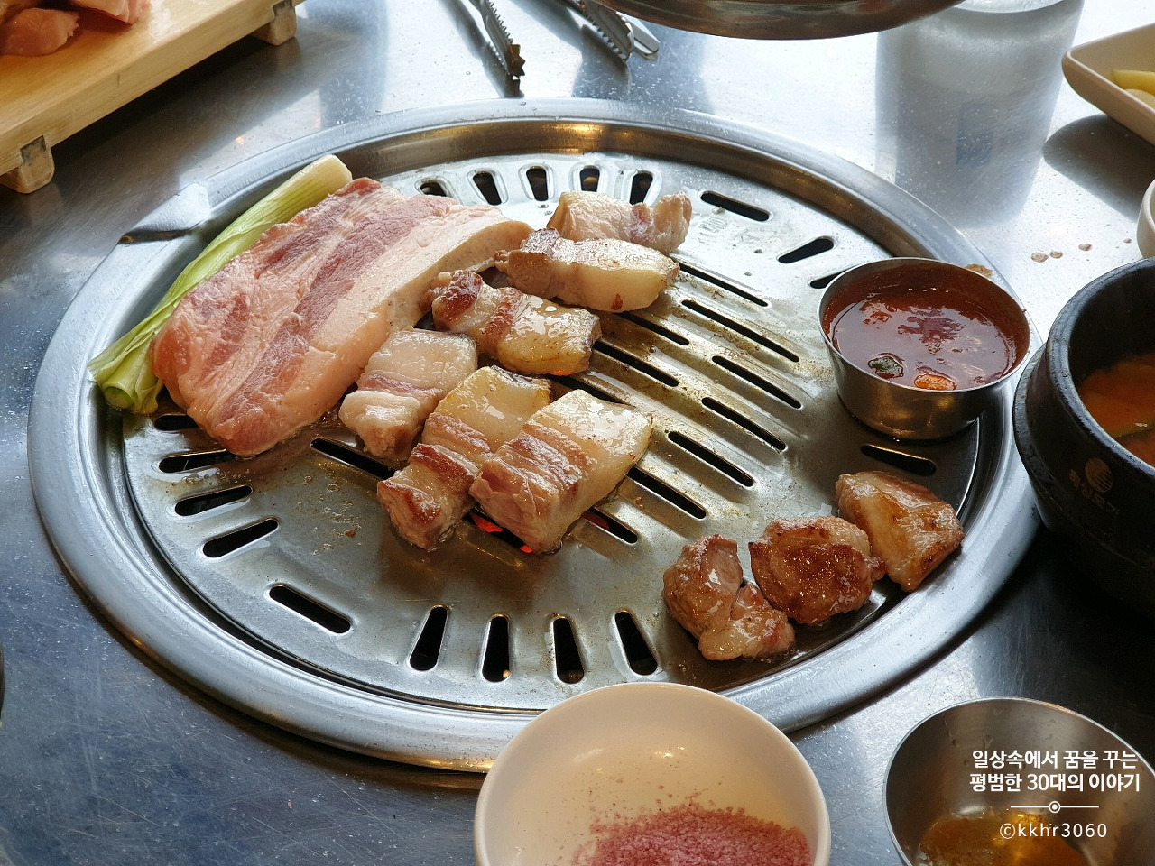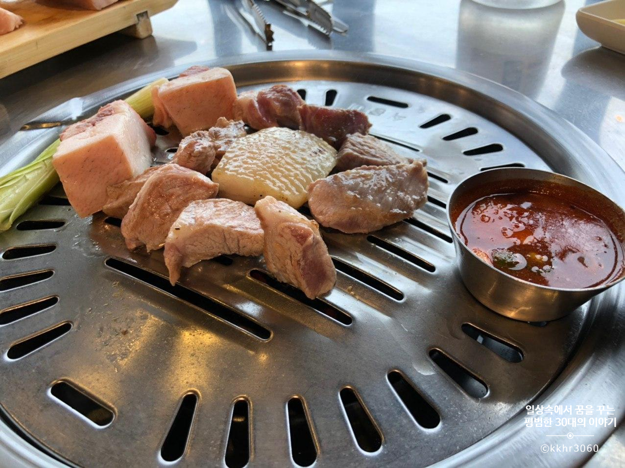 주문을 하자 기본 반찬이 상위에 놓이고 곧이어 고기도 제공됐다. 제주도 흑돼지 식당이 좋은 이유가 대부분 유명하다는 식당들은 직원분들이 직접 구워주신다. 내가 직접 구워 먹는데도 있긴 하지만 그런데는 잘 안 가려고 한다. 내가 직접 구워 먹는다고 가격이 결코 더 싸거나 하지도 않기 때문이다. 그리고 직원분들이 구워주면 아무래도 확실히 고기가 더 맛있다. 나도 따라 해보겠다고 눈치껏 봐왔던 방식대로 구워보기도 했지만 이상하게 그 맛이 안 난다.
