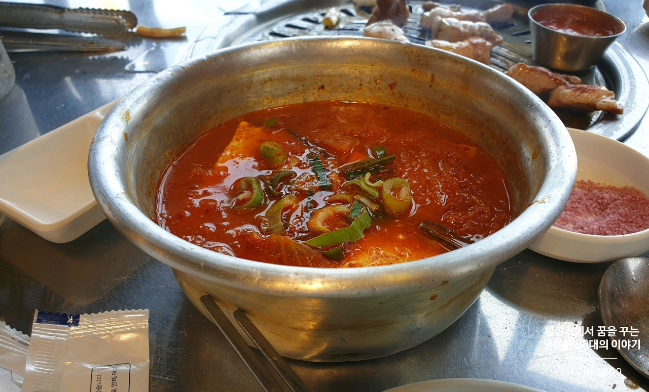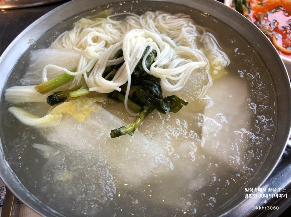 분명 흑돼지 600g이나 먹어서 배가 부른데 뭔가 허전한 마음에 동치미 유채 환상 국수(6000원)을 주문했다. 그랬는데 이게 웬걸... 이번 여행이 신혼여행이라는 것을 알게 되신 직원분이 서비스로 30시간 김치찌개(7000원)을 주신 게 아닌가. 이럴 줄 알았으면 동치미 유채 환상 국수를 주문하지 말걸 그랬다. 이미 시킨 거니 먹기는 먹었는데 맛은 없었다. 어쩐지 주문할 때 직원분이 삶은 국수에 삼삼한 동치미 국물을 부어서 나오는 거라고 설명해 주실 때부터 알아차렸어야 했는데 눈치가 없어 눈치채지 못하고 주문했던 것이다. 국물이 너무 삼삼하다 못해 무슨 맛인지 알 수가 없었고 국수는 살짝 덜 삶아졌는지 밀가루 맛이 났다. 그래도 위안 삼을만한 것은 서비스로 나온 김치찌개가 맛있었다는 것이다. 배만 안 불렀으면 공깃밥 한 개를 추가 주문해서 찐득한 국물의 김치찌개에 말아 먹었을 것 같다. 김치찌개 안에 들어있는 돼지고기는 너무 부드러웠고 김치도 꽤 맛있었다. 무엇보다 국물이.... 이건 진짜 밥 말아먹어야 하는 각인데 그럴 수 없다니 소화제라도 먹고 먹어야 하는 건가 싶었으나 저녁에 말고기를 먹기로 돼있었기 때문에 자제하기로 하고 그냥 건더기만 다 건져먹었다.