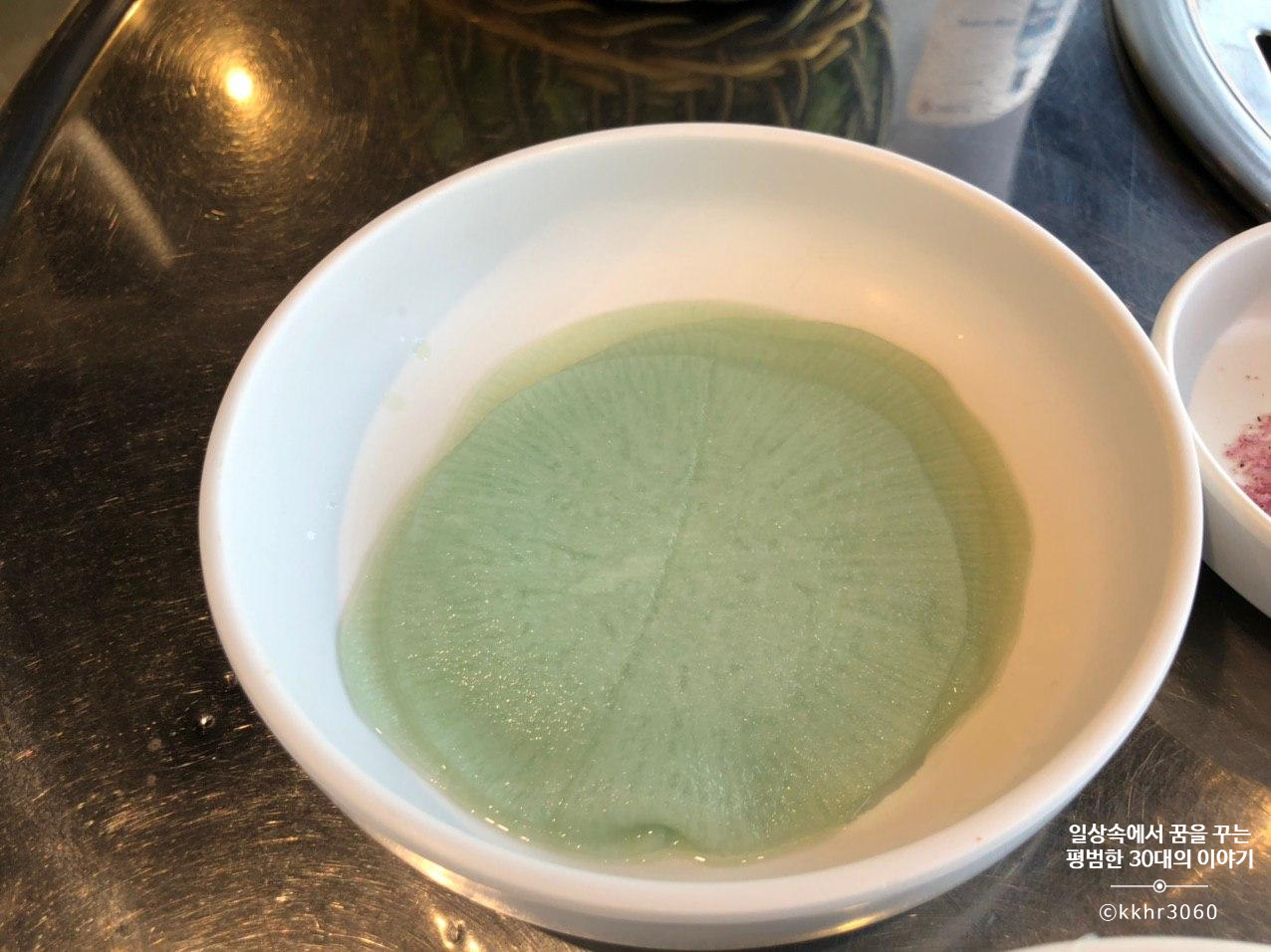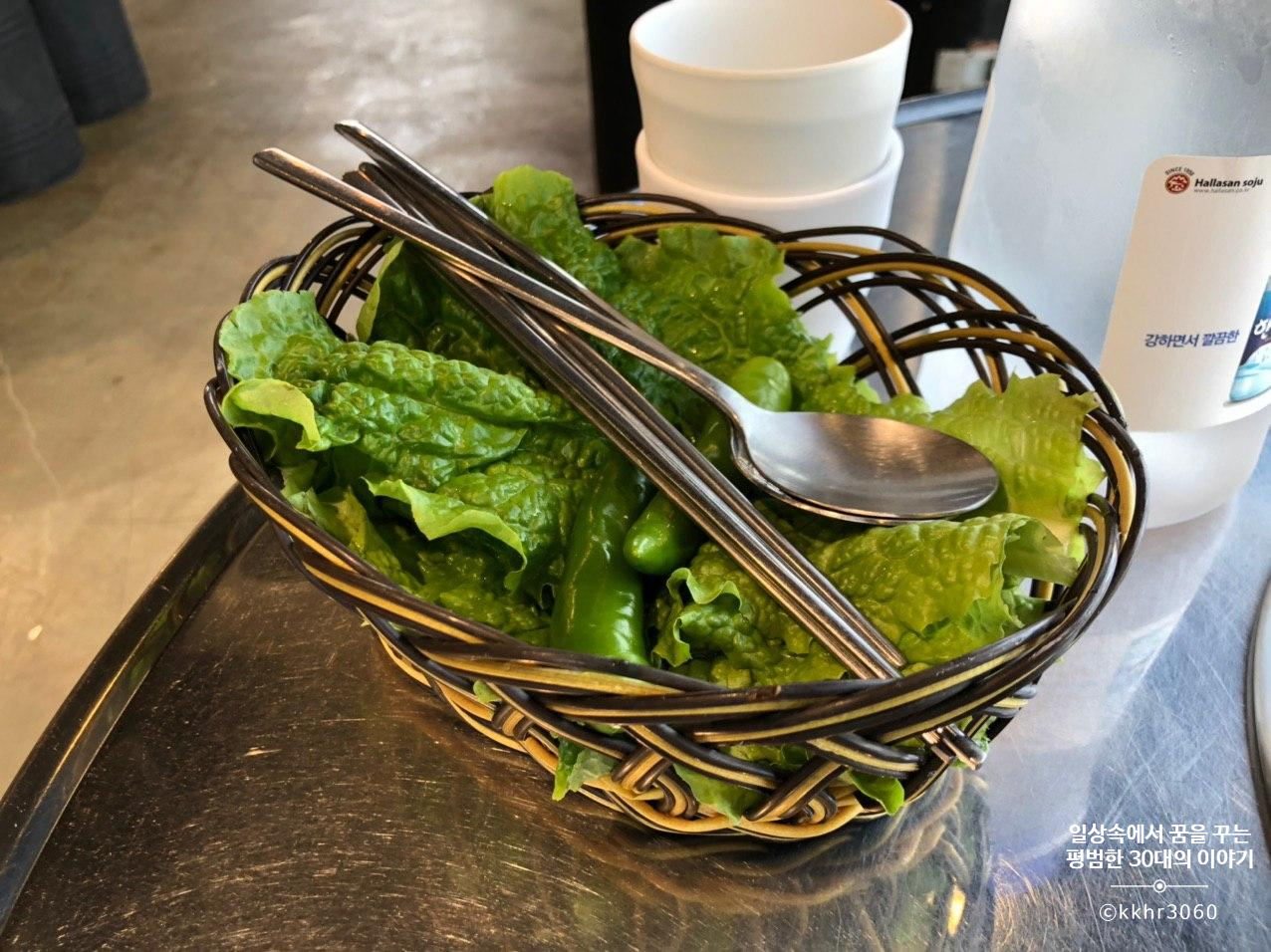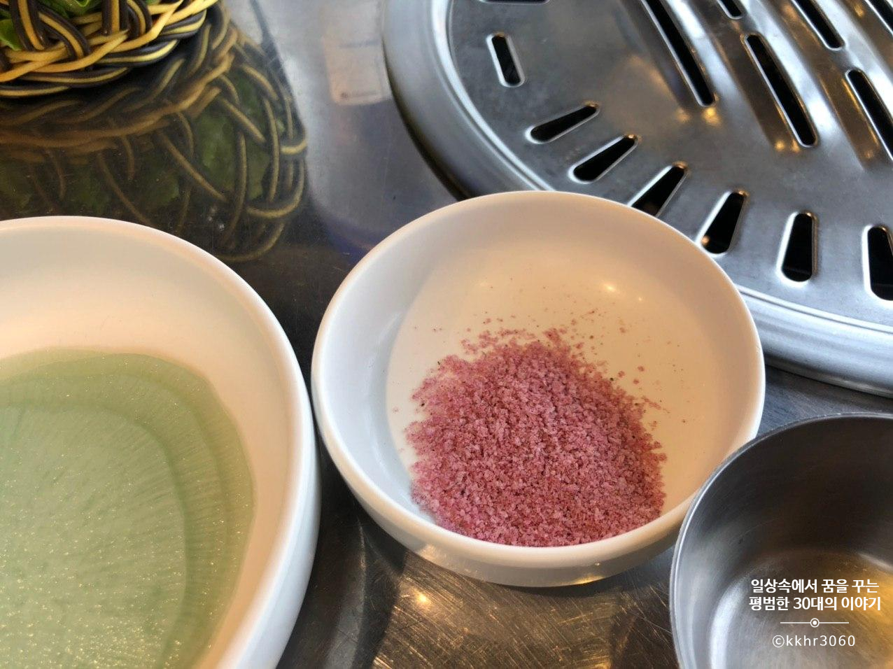 소금은 녹차소금과 백년초 소금 이렇게 두 가지를 준비해 주셨다. 고기를 찍어 먹어보면 아주 미세한 차이가 나긴 하는데 개인적으로 일반 소금이 제일 맛있는 것 같다. (단순한 입맛을 가진 나란 여자)