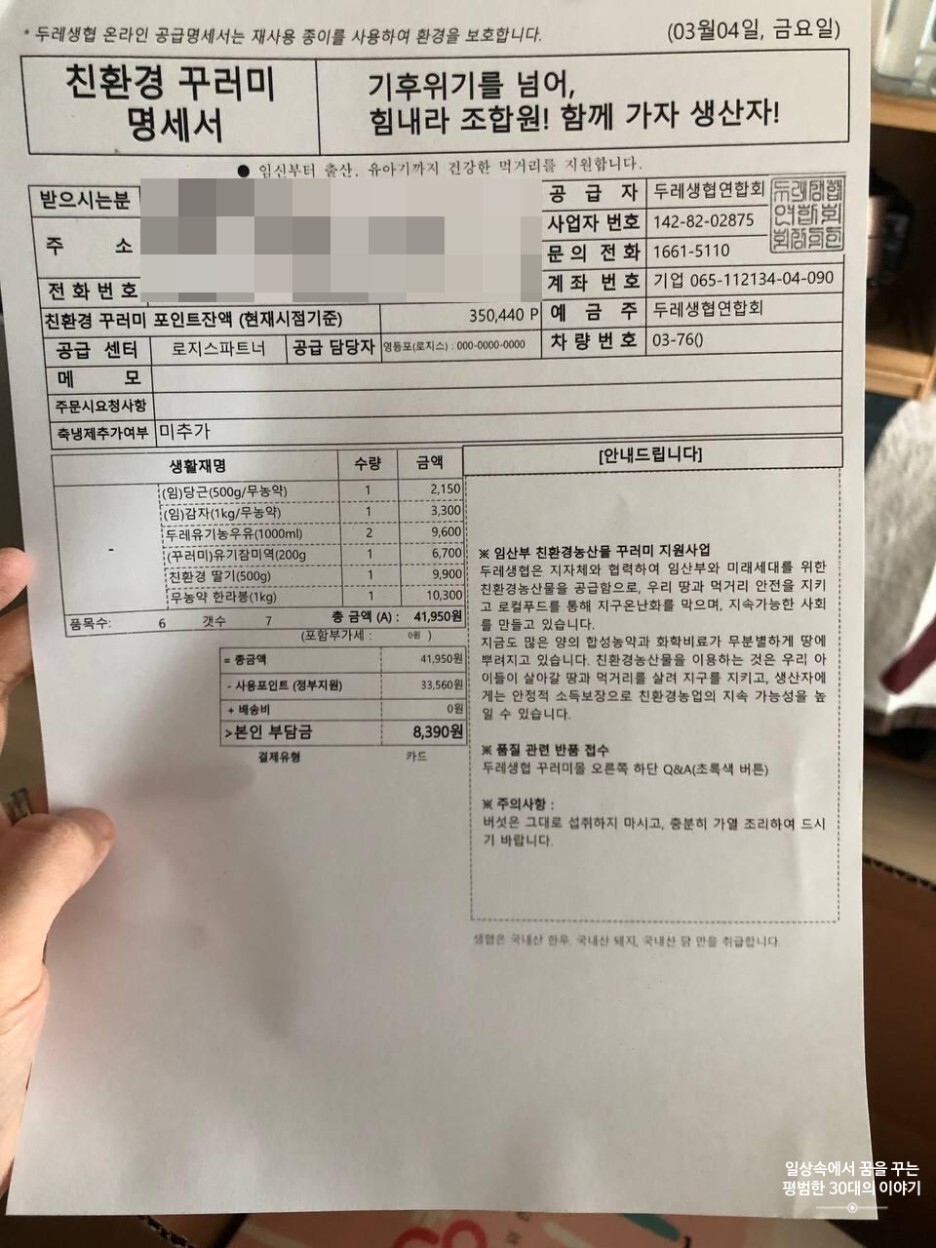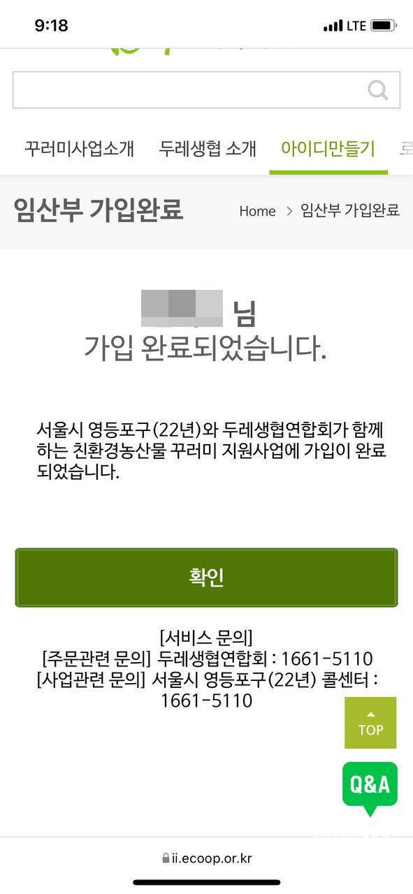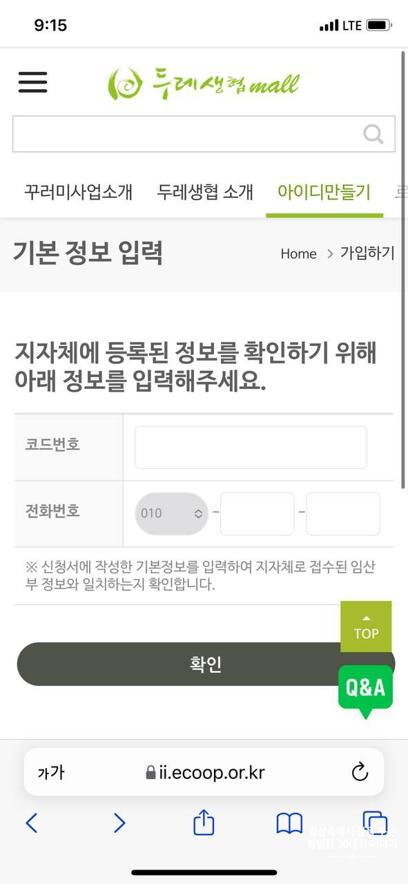 2. 영등포구에서 당첨문자와 함께 코드 번호를 알려주는데 이 때, 안내 받은 코드번호와 함께 영등포구의 임산부 친환경 농산물 꾸러미 지원사업 협력사 웹사이트(올해는 두레 생협)를 방문하여 회원가입을 하면 된다.