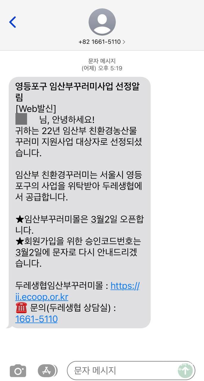 임산부 친환경 농산물 꾸러미 지원 사업 대상자 선정 문자 받음