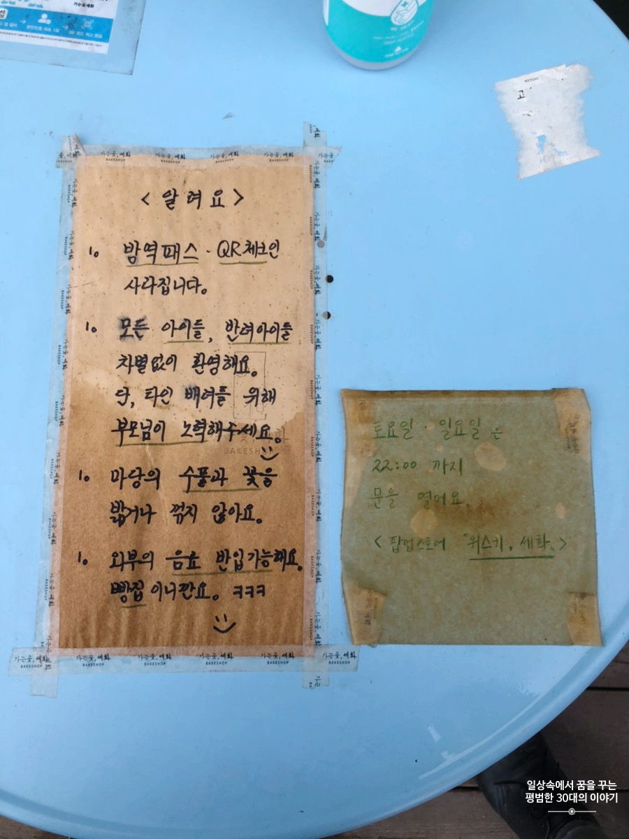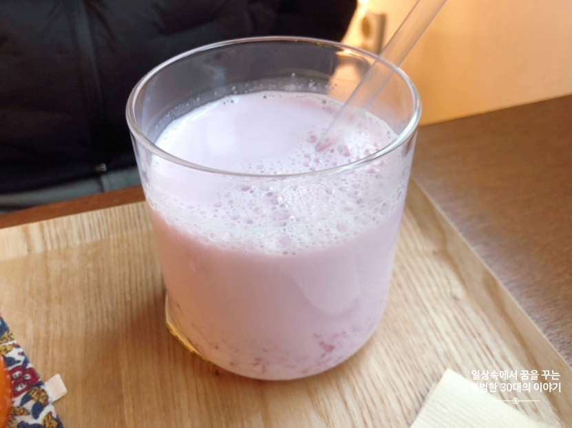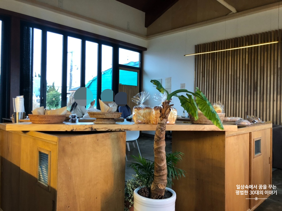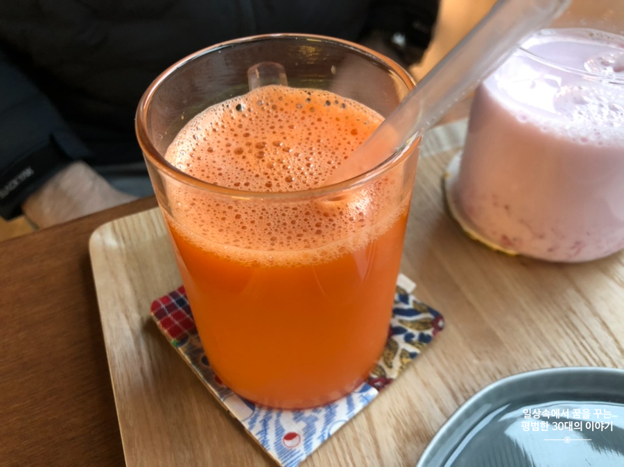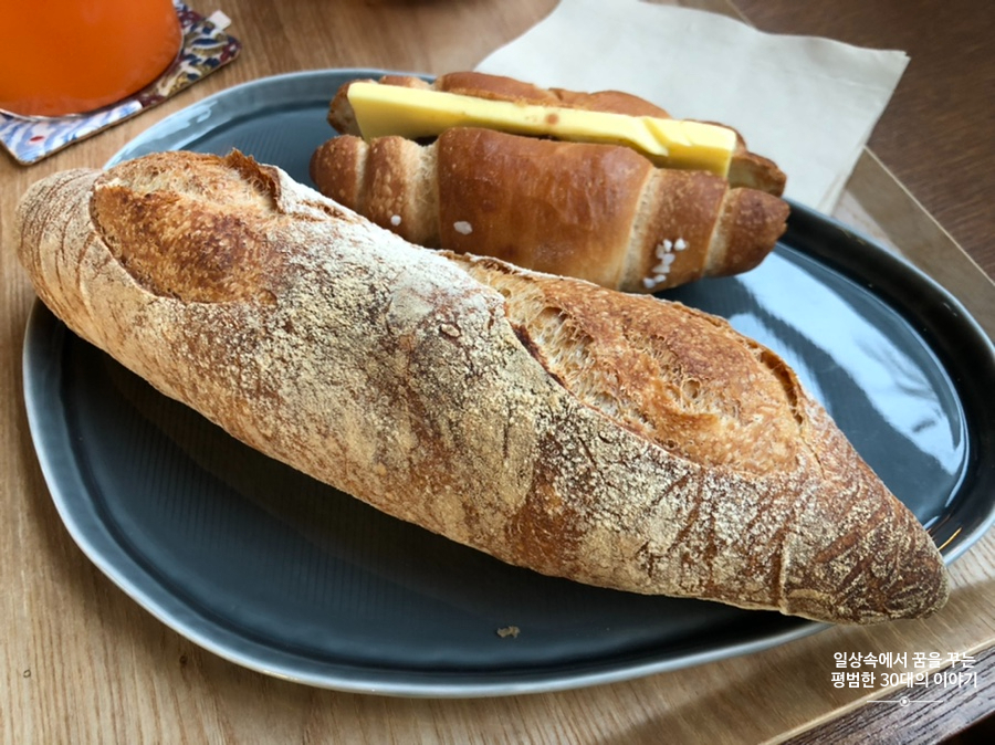 우리나라에서 파는 바게트는 다 별로라며 항상 불만인 남편에게 오랜만에 맛있는 바게트였는지 순식간에 먹어치웠다. 앙버터는 아무래도 우리가 오후에 방문해서인지(이미 만들어진지 꽤 시간이 지났을지도) 앙버터 빵이 원래 건조하고 딱딱하다는 것을 감안했음에도 무척 건조하고 딱딱했다. 그래도 이 주변에서 맛있는 빵집으로 소문이 난건지 빵만 사서 가는 사람도 많았다. 당근주스랑 제주생딸기 우유는 뭐 맛이 없기 힘든 메뉴이므로 설명하지 않겠다.