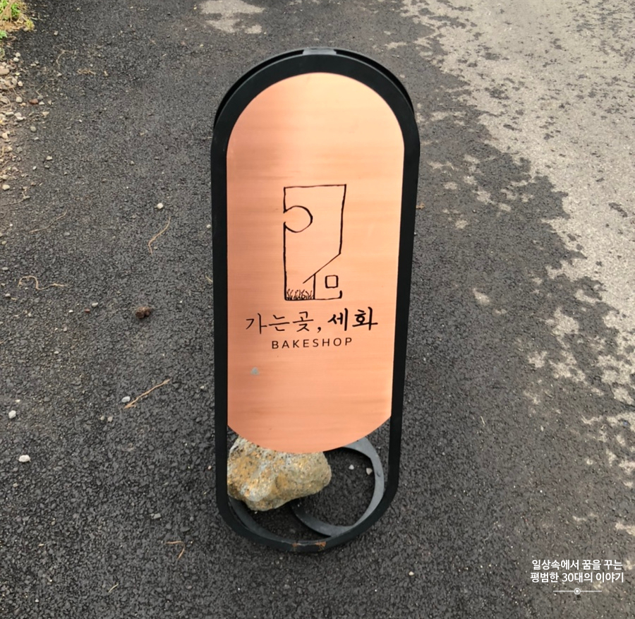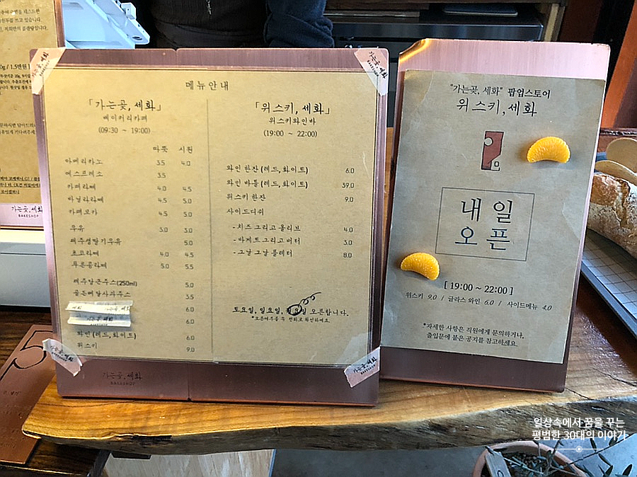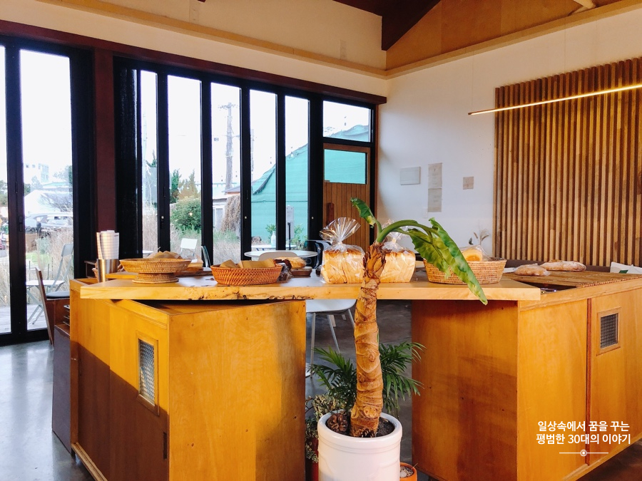 하늘은 여전히 흐리고 바람은 매섭다. 그래서 찾은 곳은 이 근방에서 저녁 7시까지 영업을 하는 몇 안되는 카페, 가는곶, 세화. 제주도는 모든 게 일찍 닫는다. 특히나 나와 남편처럼 술을 아예 안 마시는 사람에게는 밤은 일찍 찾아오고 그 덕에 숙소에 일찍 들어가 각자 컴퓨터로 할 일을 하곤 한다. 제주에서 우리의 저녁은 서울에서와 별반 다르지 않다. 어쨌든 가는곶, 세화를 방문했을 때는 이미 5시반을 넘긴 때라 대부분의 빵은 이미 품절인 상태였고 손님도 그다지 많지 않았다. 바게트 빵을 좋아하는 남편은 반신반의하며 바게트빵을 버터를 좋아하는 나는 앙버터를 주문했다. 그리고 제주생딸기우유(5000원)와 제주당근주스 250ml(5000원)을 주문했다.