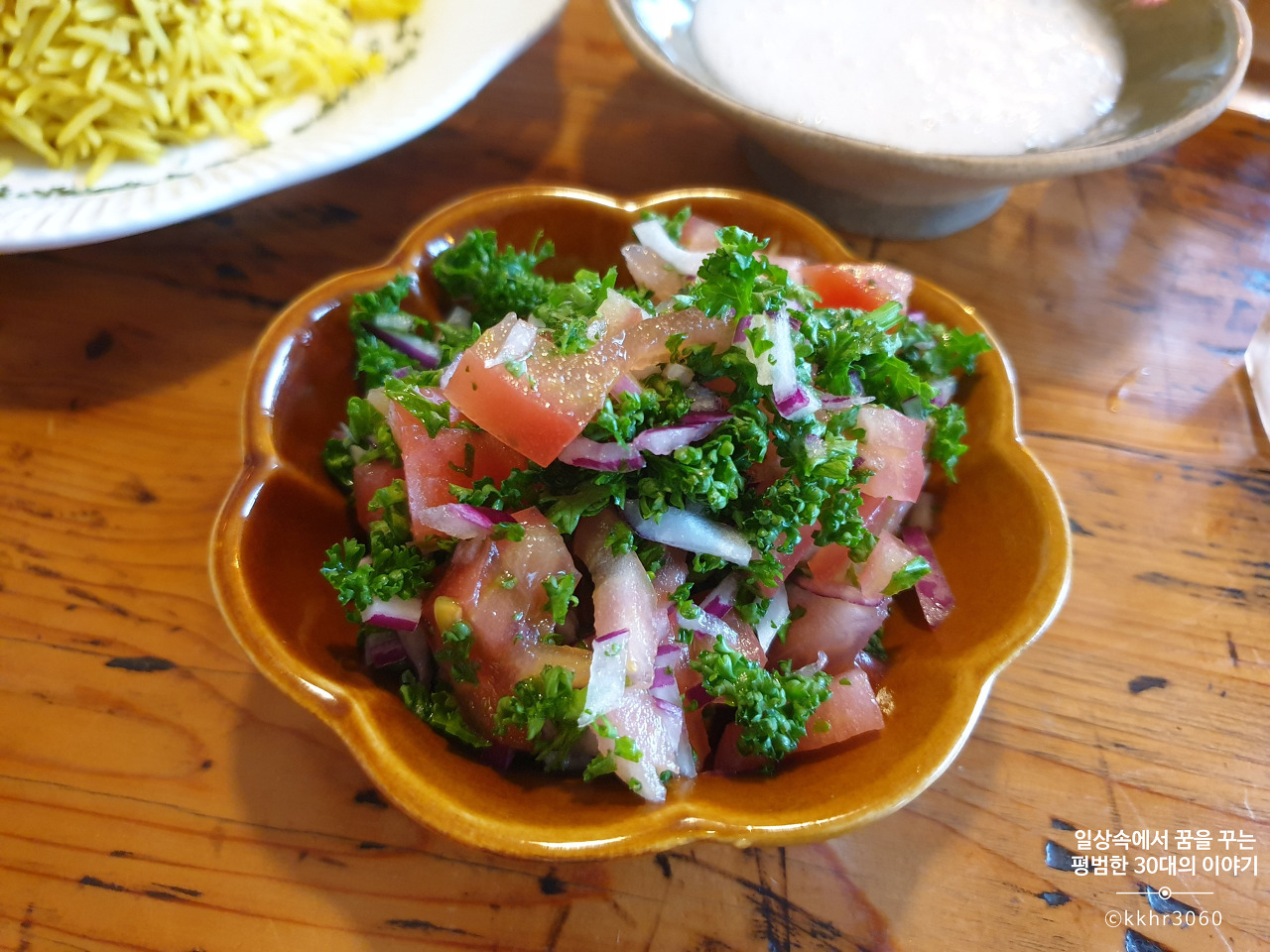 작은 그릇에 토마토 샐러드도 제공되었는데 우리 입맛에는 향신료 맛이 강해서 먹기가 조금 어려웠다. (참고로 나는 고수 마니아)