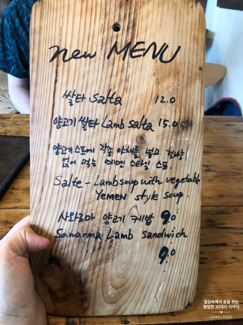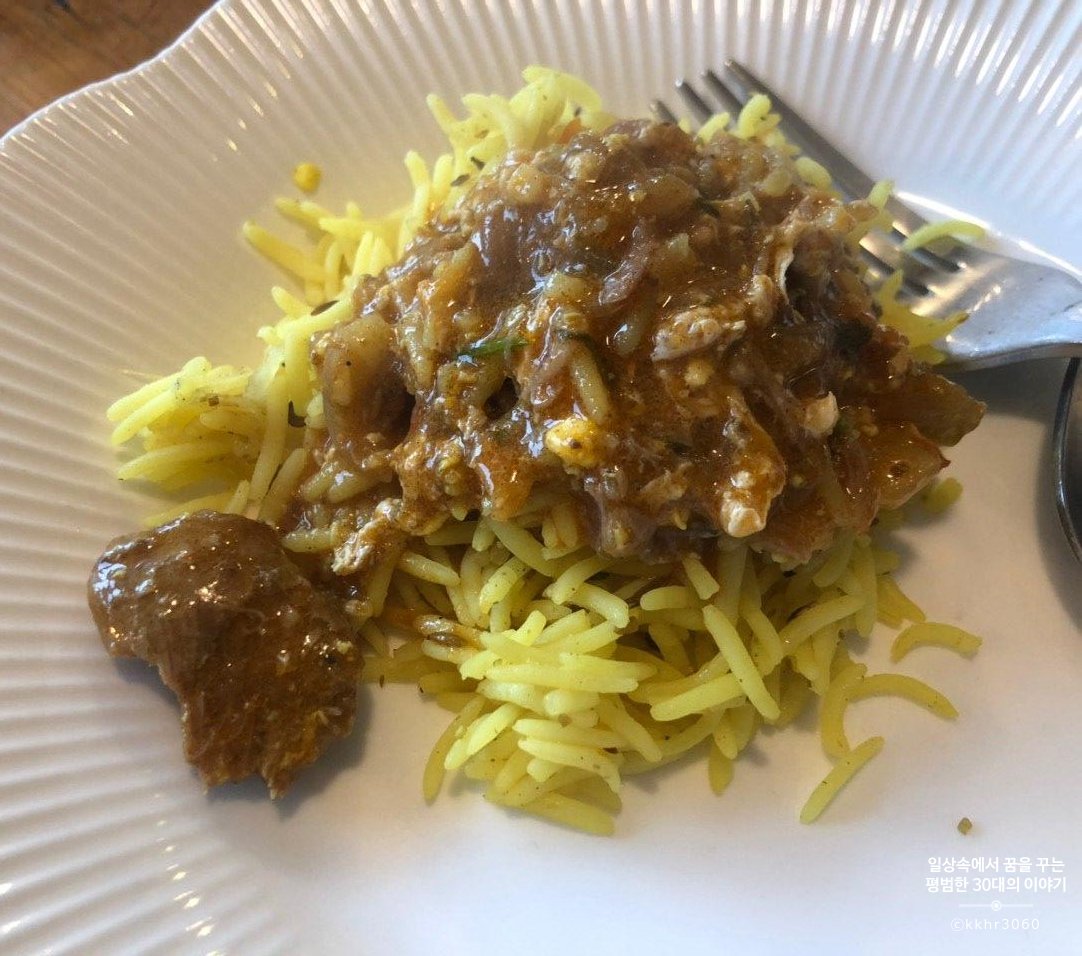 주인분께서 쌀타는 전쟁 중에 먹을 게 없었던 예멘 사람들이 자주 먹던 음식인데 그때그때 가지고 있는 재료를 솥에 넣고 끓여먹었던 스튜라고 설명해 주셨다. 그 스튜 위에 헐바라는 소스(?)를 올려먹는 게 예멘 스타일이라고 하셨다. 예멘 사람들에게 헐바는 약과도 같다고 한다. 그만큼 건강에 좋다는 의미인듯. 그래서 헐바만 따로 먹어보기도 하고 쌀타 위에 더 첨하도 해서 먹어보기도 하고 호브스를 헐바에 찍어 먹어보기도 했는데 내 입맛에는 그냥 따로 먹는 게 제일 맛있었다. 향신료를 싫어하시는 분들이라면 조금 싫어하실 수도 있는데 시큼하면서 짠맛이 나는 소스였는데 말로 설명하기 어려운 그런 맛이기 때문에 직접 가서 경험해보는 게 최고인 듯. 흩날리는 밥 위에 쌀타를 올려 비벼 먹으니 참 맛있다. 향신료 맛은 강하지 않았는데 주문할 때 향신료를 어느 정도 넣어주면 될지 물어봐 주시기 때문에 본인의 취향에 맞게 부탁하면 될 듯하다. 우리는 적당히. 세상 제일 어렵다는 적당히.