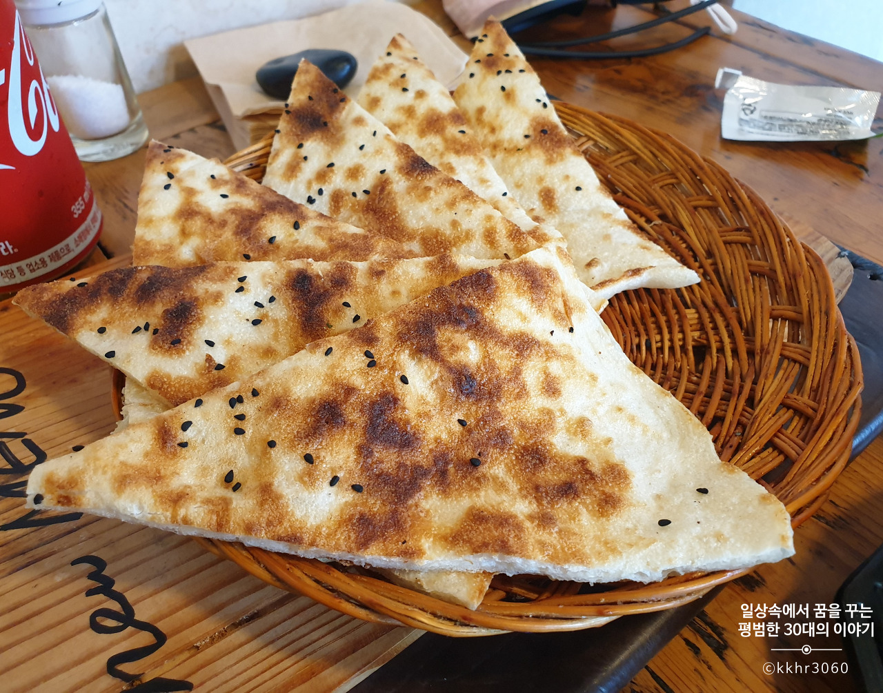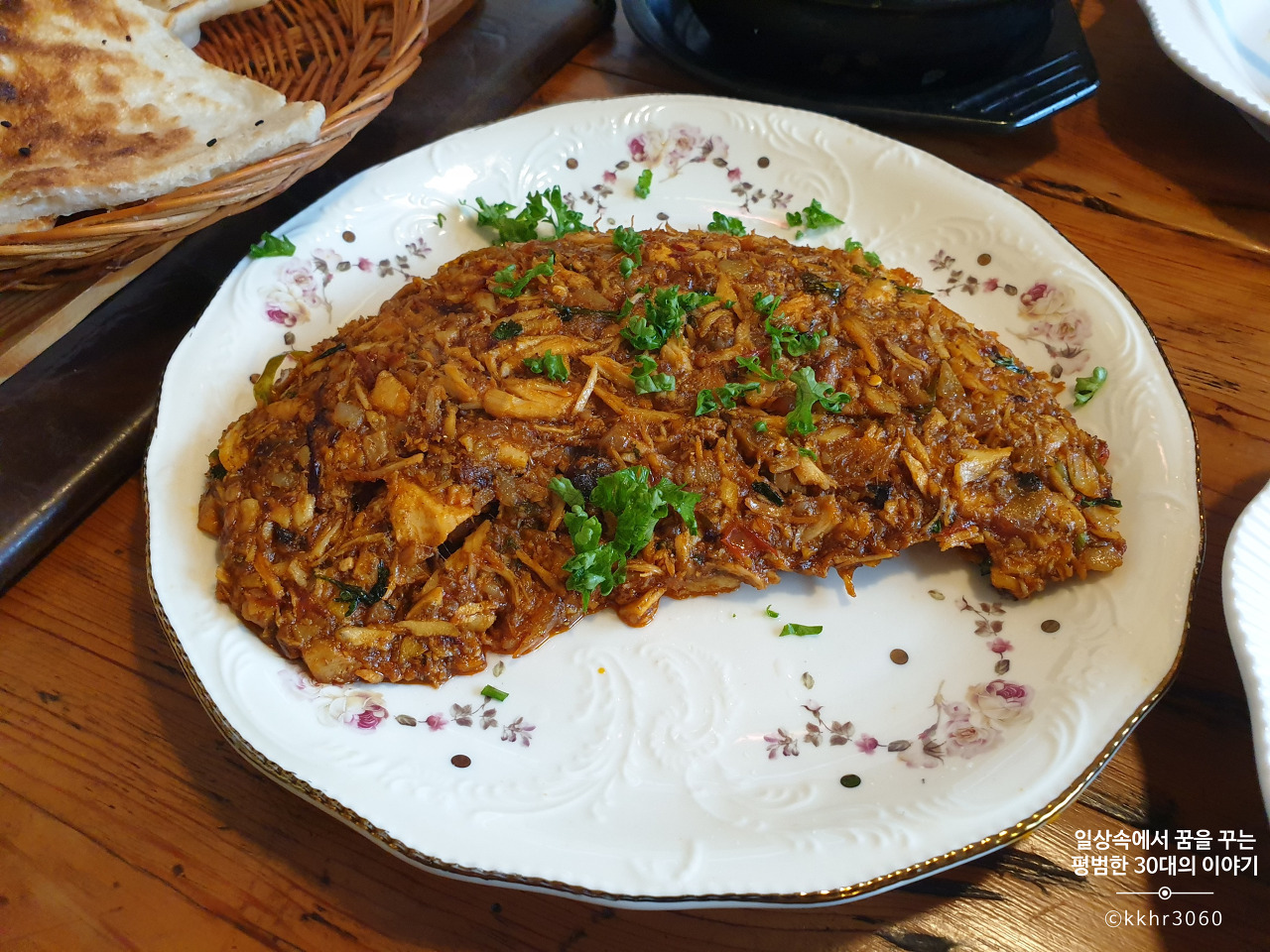 그다음 나온 아그다 치킨과 호브스 (10000원). 치킨 가슴살과 여러 가지 채소를 매운 소스, 매운 고추와 함께 볶은 요리인데 호브스 위에 요거트 소시를 올려 먹으면 맛있다. 호브스는 인도의 난과 맛이 좀 비슷했는데 좀 더 두껍고 단단한 편이어서 아그다 치킨을 올려도 형태가 흐트러지지 않아 먹기 좋았다. 짝꿍은 호브스 위에 아그다 치킨과 요구르트 소스를 올려 먹는 게 제일 맛있다 했는데 내 입맛에는 호브스 위에 아그다 치킨과 간 토마토(향신료가 첨가된)를 올려 먹는 게 제일 맛있었다. 뭐 다 각자 자기 취향이 있으니 알아서 제공되는 소스를 섞어서 올려먹다 보면 어느 순간 본인의 취향을 찾게 될 듯. 다양하게 시도해 보는 재미가 있으니 말이다.