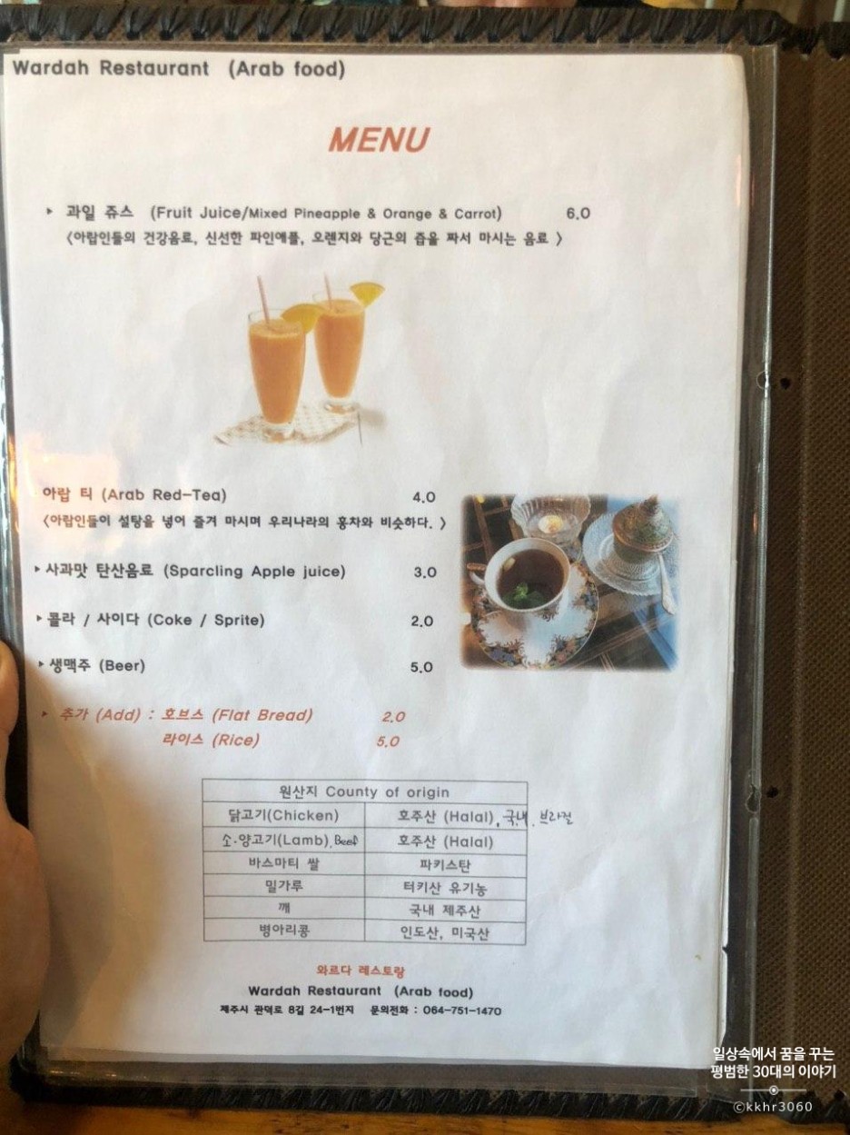 우리는 이미 몇 주 전에 레바논 음식점을 다녀왔기 때문에 일반적인 아랍 음식은 눈에 들어오지 않았다. 이 식당에 방문한 이유는 오로지 예멘 음식을 접해보기 위함이었기 때문이다. 그래서 메뉴 옆에 예멘 음식이라고 적혀있는 것들 위주로 주문했다. 아그다 치킨과 호브스 (10000원), 양고기 쌀타 (15000원) 그리고 파인애플, 오렌지와 당근의 즙을 짜서 만들었다는 주스 (6000원)를 한 잔 주문했다.