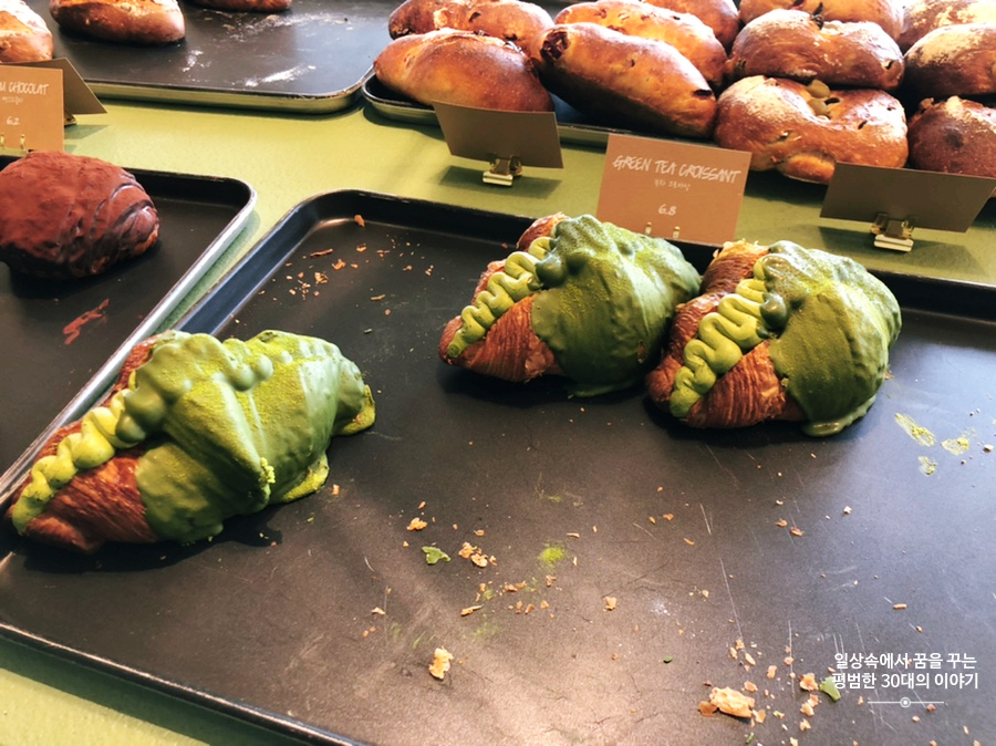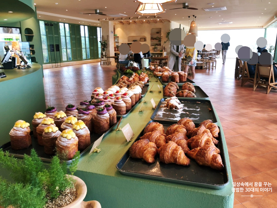 내부는 무척 넓었으나 넓은 공간에 비해 좌석이 많지는 않았다. 향후 같은 건물 3~4층도 오픈할 예정인가 보던데 그때 되면 좌석이 더 많아지겠지. 어쨌든 점심을 먹고 가서 배가 불렀음에도 여기까지 와서 베이커리류를 안 먹고 가는 건 아쉬울 것 같아서 녹차 크루아상(6800원)과 쿠앤크 크림빵(4800원)을 주문하였고 음료는 한라봉차(8500원)과 아메리카노(7000원)를 주문하였다. 밥값보다 비싼 디저트와 음료라니... 남편은 다시 한번 제주도의 물가에 놀랐고 그만한 값어치가 있는지 나에게 따지기 위해 카페 내부와 우리가 주문한 디저트와 음료를 살펴보기 시작했다. 나도 제주도에 오면서 매번 물가에 여러 번 놀라곤 한다. 매번 올 때마다 가격이 조금씩 더 올라있는 것 같다.
