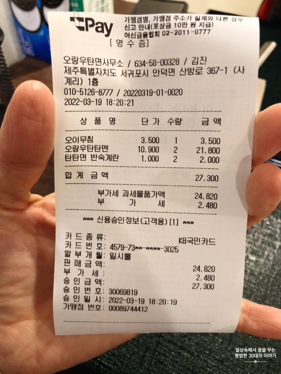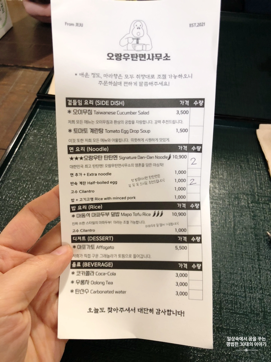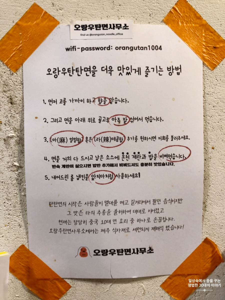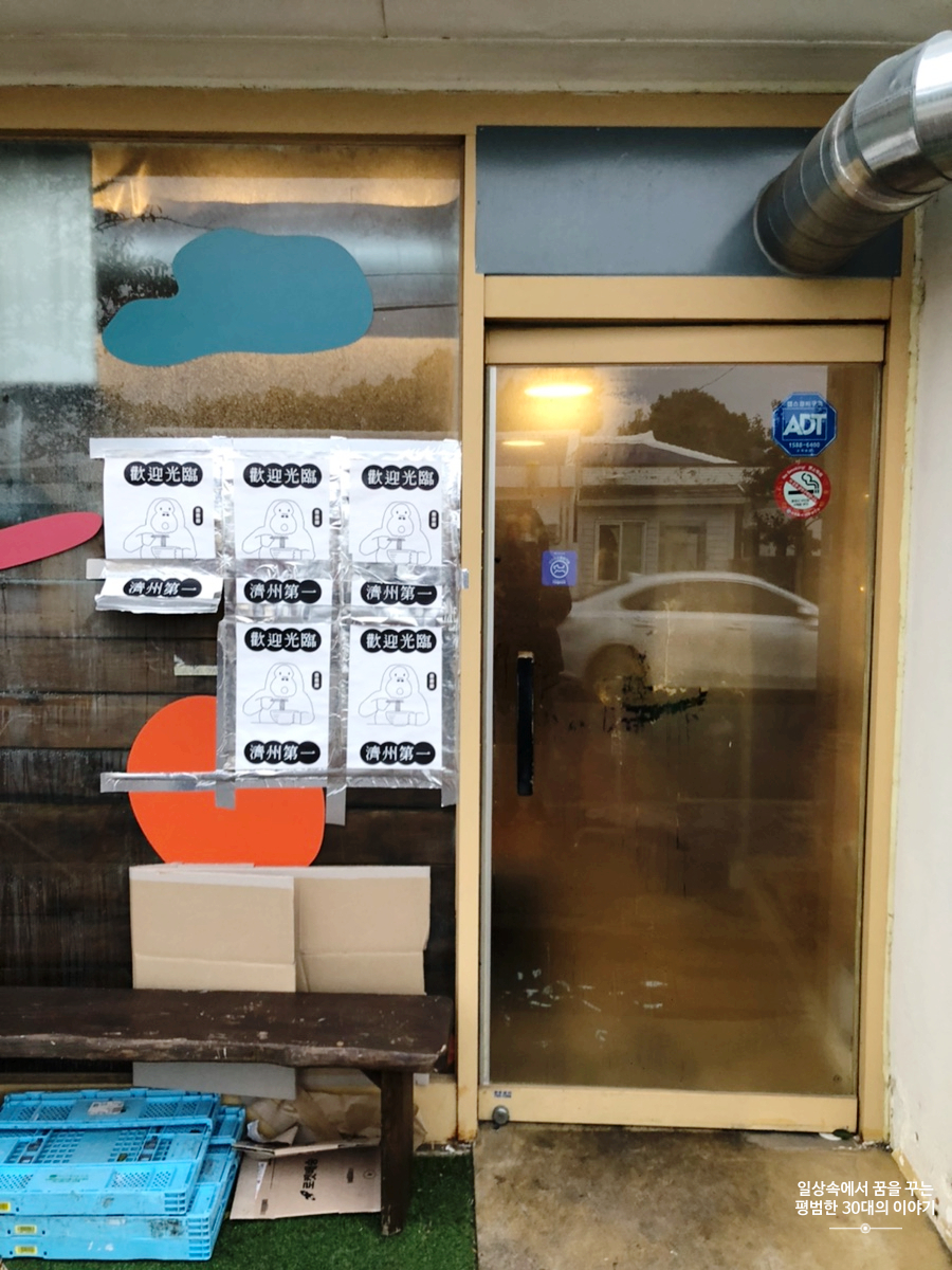 우리는 분명 봄날씨라고 해서 제주도를 갔는데 제주도는 고사리 장마라고 해서 우리가 제주도에 있는 6일 내내 비와 함께 차가운 바람을 선사하였다. 그러다 보니 숙소에 있는 시간이 길어지면서 게으름이 발동하여 저녁은 대부분 숙소에서 가까운 곳에서 해결하였다. 그 덕에 그냥 지나칠 수 있었던 맛집을 많이 알게 되었다. '오랑우탄면사무소'도 그중 하나! 버스정류장 바로 앞에 있어서 찾기 어렵지 않다.