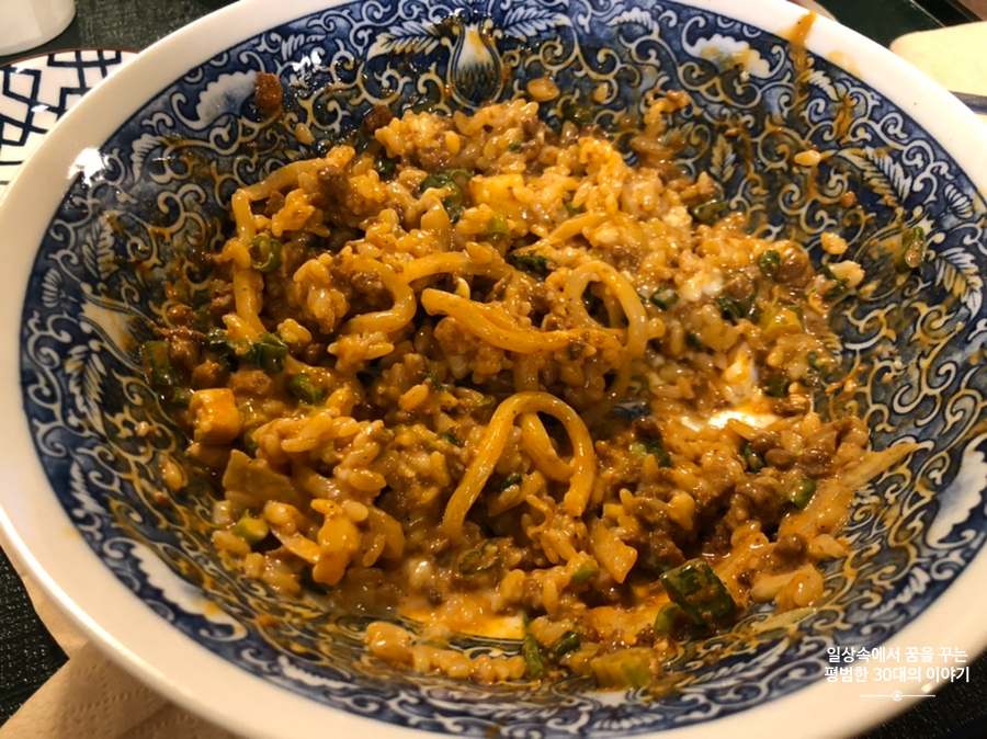 메인 메뉴는 탄탄면과 마파두부 두 가지가 있고 사이드 메뉴로 오이 무침과 토마토 계란탕이 있다. 우리는 메인 메뉴로 탄탄면에 반숙 계란을 추가하였고 사이드 메뉴로 오이 무침을 주문하였다. 친절한 사장님께서 어떻게 먹으면 되는지 설명해 주셨고 그에 따라 꾸덕꾸덕한 탄탄면을 양념이 골고루 스며들 수 있도록 열심히 비빈 후, 면치기를 시작했다. 순식간에 면을 먹어치우고 난 후, 공깃밥과 추가 주문한 반숙 계란을 넣고 또 열심히 비빈 후, 순식간에 먹어치웠다. 땅콩소스의 고소함과 마라의 얼얼함과 매콤함이 입안에 싹 퍼지면서 침샘을 폭발시켰다. 나는 원래도 마라의 마니아이기 때문에 이 탄탄면과 사랑에 빠지지 않을 수 없었는데 짝꿍 같은 경우, 마라를 그다지 좋아하지 않는데도 이곳의 탄탄면만큼은 입에 맞는지 밥까지 싹싹 비벼서 순식간에 먹어치우더라. 탄탄면의 맵기 정도는 조절할 수 있는데 가장 기본은 떡볶이 정도의 맵기 레벨을 가진 짝꿍에게 살짝 맵게 느껴지는 정도였다. 사이드 메뉴로 주문한 오이무침은 상큼한 맛의 피클 같았는데 탄탄면과 제법 잘 어울렸다. 처음에는 양이 너무 적은 거 아닌가 싶었는데 면에 밥까지 비벼 먹고 나니 충분히 배가 불렀다. 하지만 다음에는 면을 추가해서 먹을 듯! 새로운 스타일의 음식을 먹어볼 수 있었던 너무 만족스러웠던 저녁 식사.