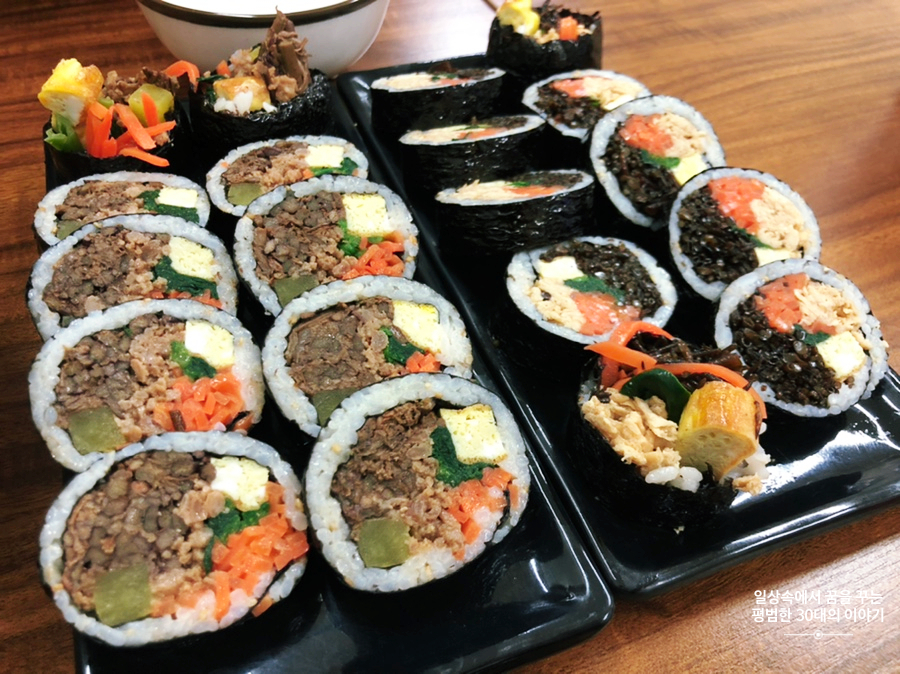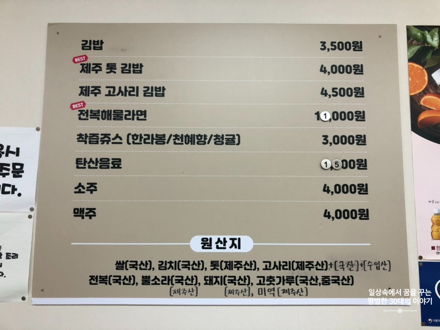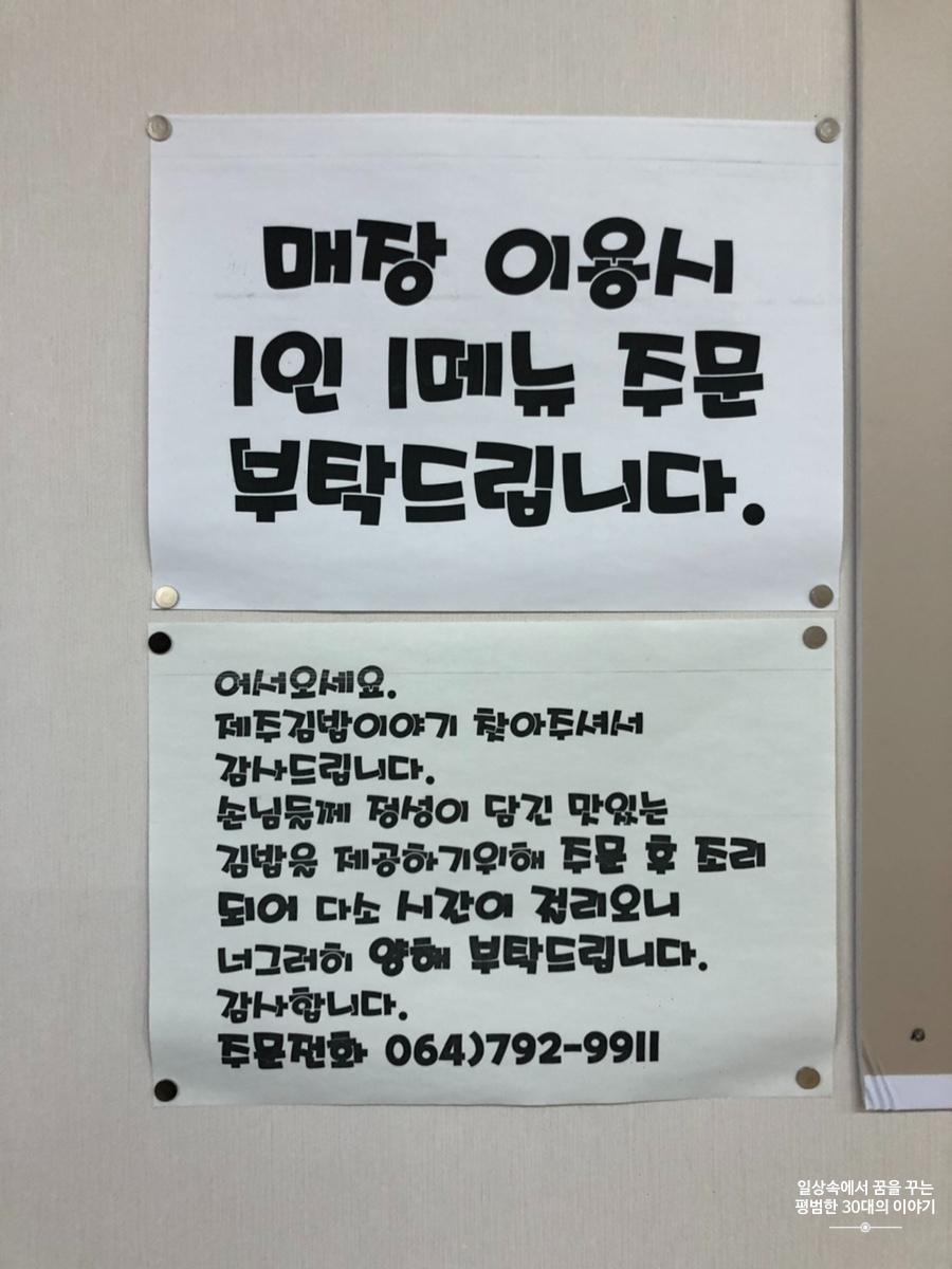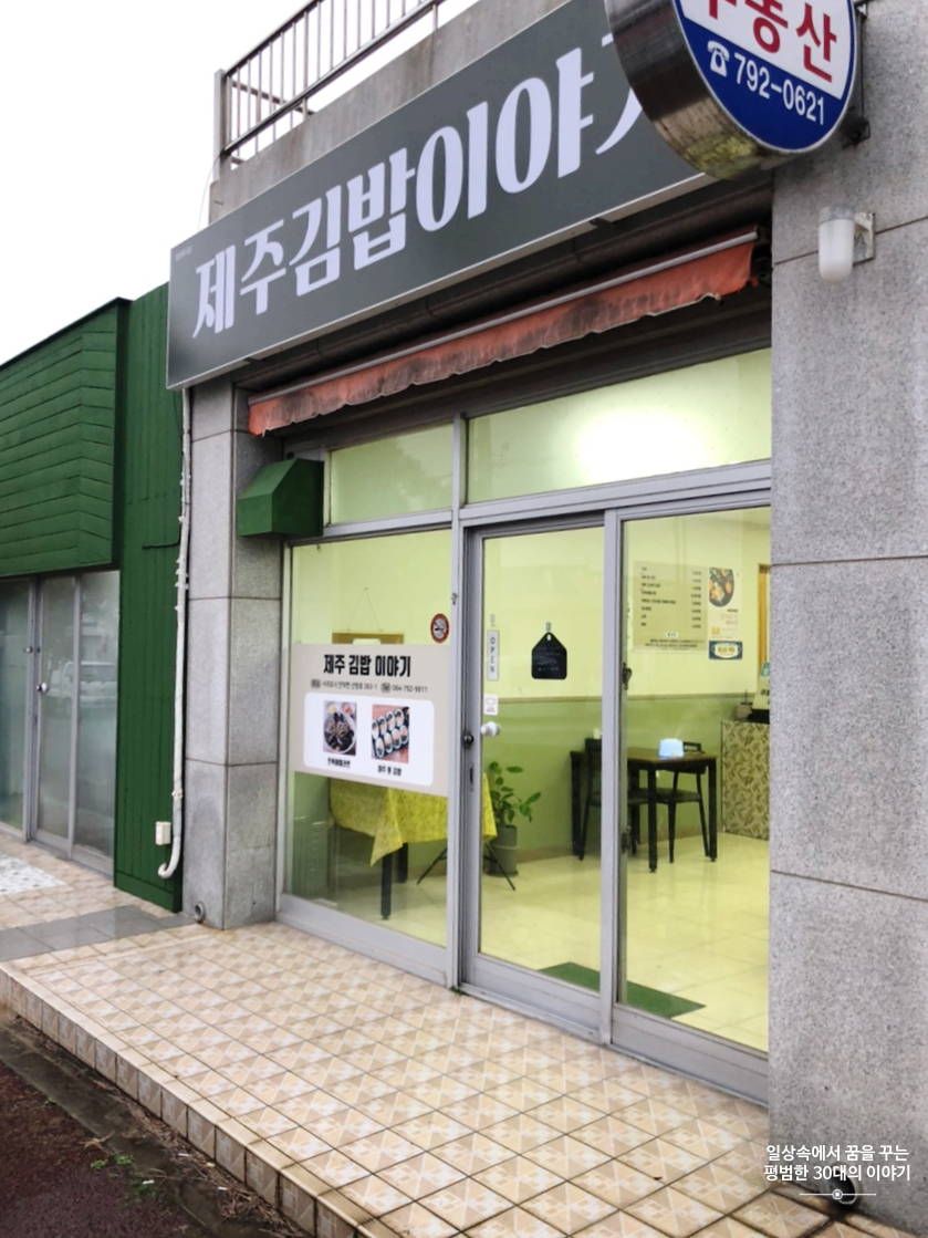 이날도 마찬가지로 흐린 날씨 탓에 숙소 주변에서 저녁을 먹기 위해 동네를 어슬렁거리고 있었다. 며칠 전부터 계속 김밥이 먹고 싶었는데 사장님께서 육지에 가신 탓에 며칠째 문이 닫혀있었는데 우리가 떠나기 전날, 문을 여신 게 아니던가. 그래서 당연히 고민할 것도 없이 이날의 저녁은 '제주김밥이야기'로 결정! 내부는 그다지 넓지 않은데 4인 테이블 두 개와 2인 테이블 한 개가 전부이다.