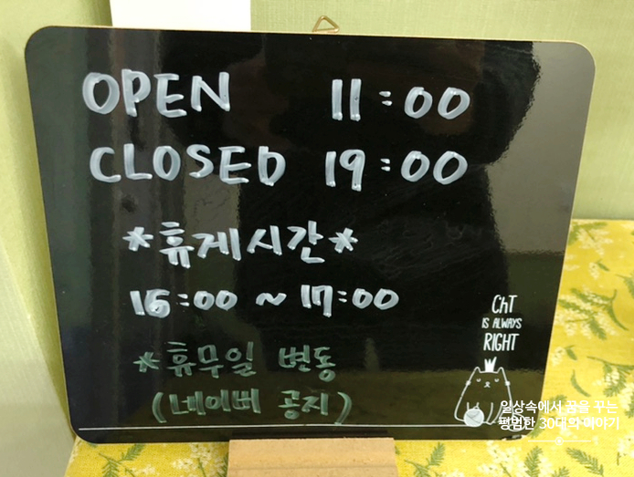 영업시간: 매일 11:00~19:00 / 브레이크 타임 16:00~17:00 / 라스트 오더 18:45