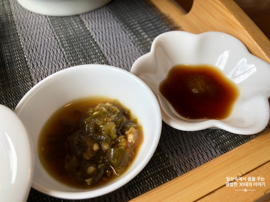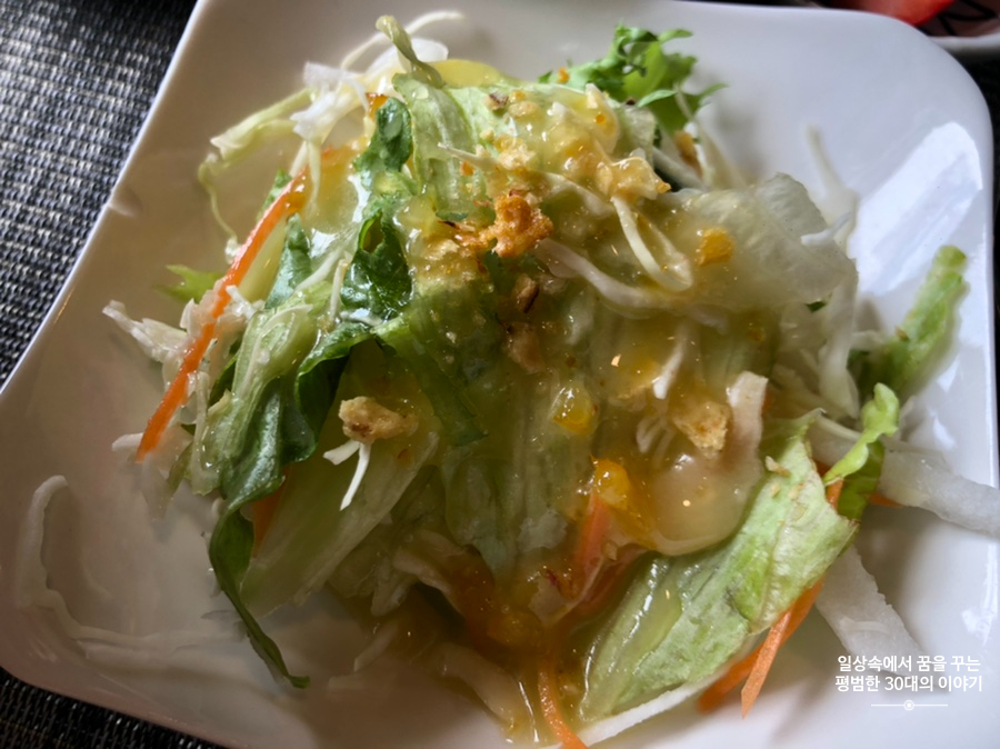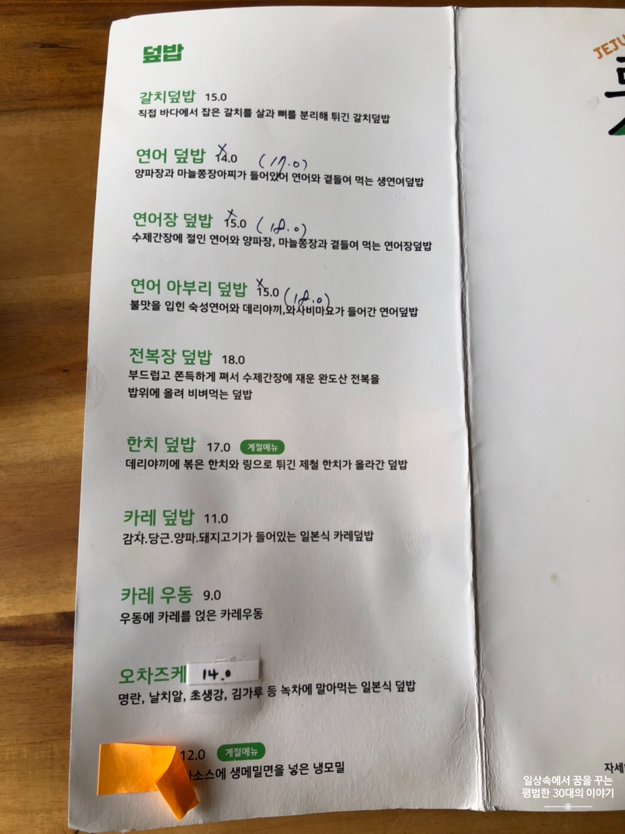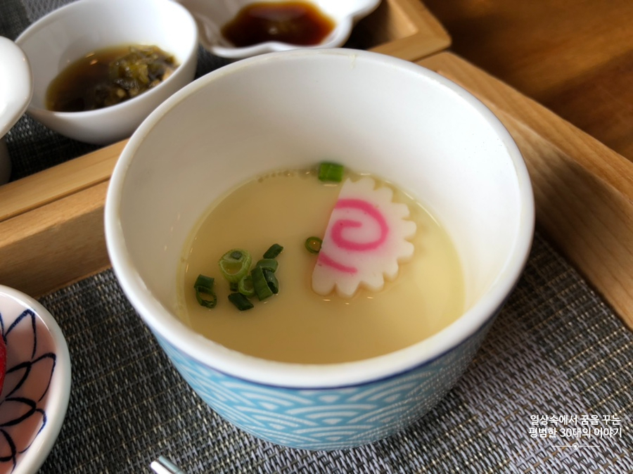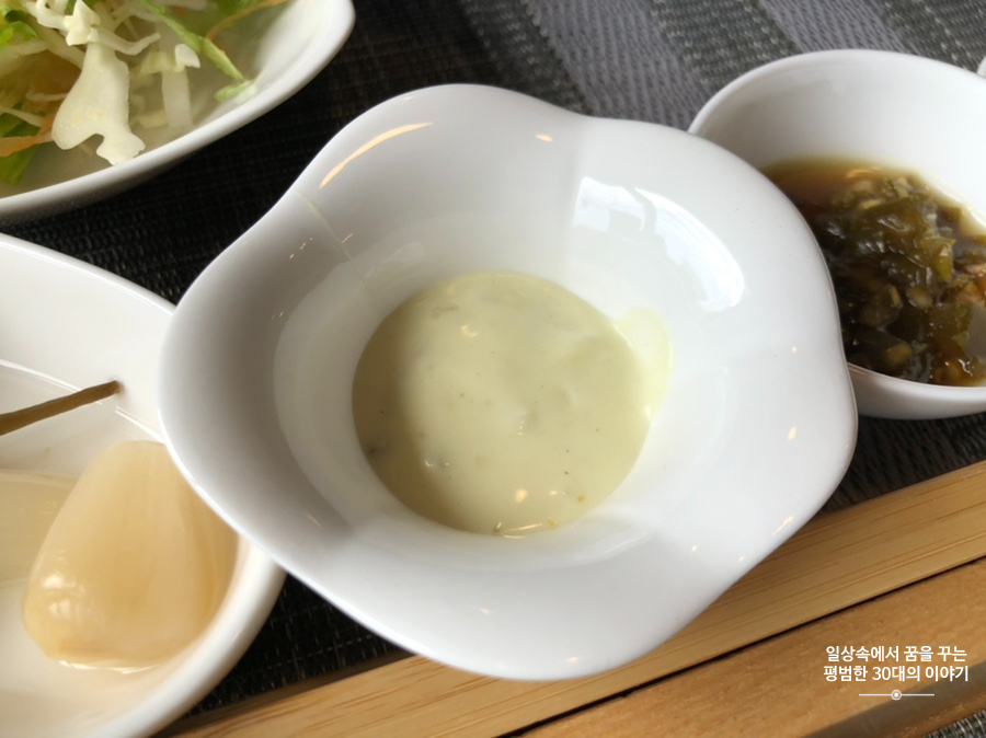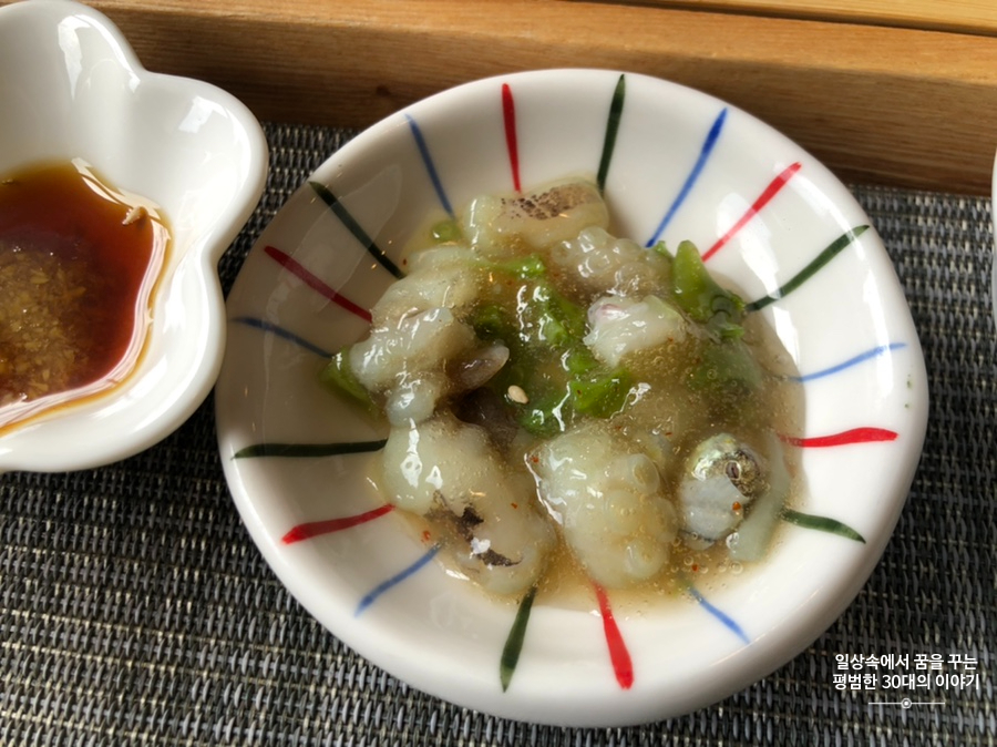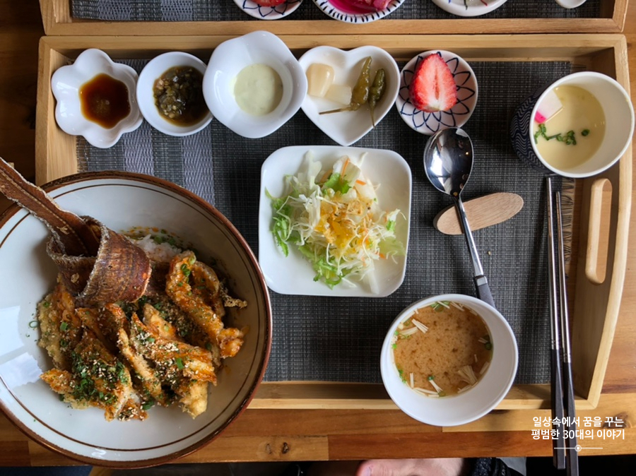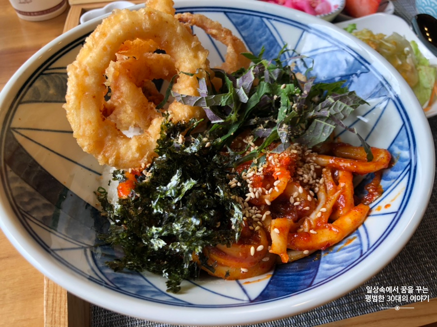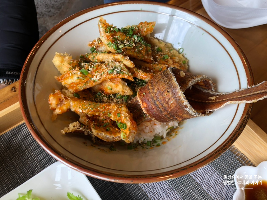 우리는 갈치 덮밥(15000원)과 한치 덮밥(17000원/계절메뉴)를 주문했다. 갈치 덮밥에는 가시를 제거한 갈치 튀김과 갈치 뼈(?)를 통째로 튀긴 게 양념된 밥 위에 올라가 있고 한치 덮밥은 한치 튀김과 매콤 새콤한 양념에 볶은 한치가 밥 위에 올라가 있다. 반찬으로 계란찜, 유자소스 샐러드, 고추냉이에 버무린 낙지, 양배추 절임, 소스, 된장국 등이 나온다. 메인 메뉴가 무엇이냐에 따라 반찬이 달라지는 것 같다. 개인적으로는 갈치 덮밥이 한치 덮밥보다 더 맛있었다. 가시가 제거된 갈치라 먹기 편했고 부드러우며 촉촉했다. 그리고 튀김이니 맛이 없을 리가 있나! 그리고 무엇보다 갈치 뼈(?)를 통째로 튀긴 게 특이했는데 무척 고소하면서 바삭했는데 맛이 장어뼈 튀김을 연상시켰다. 밥의 양념은 일본식 덮밥을 생각하면 된다. 나는 한치 덮밥에 기대가 컸는데 내 기대가 너무 컸던 것 같다. 한치 튀김을 먹은 뒤 양념에 볶은 한치를 김, 깻잎과 함께 비빔밥처럼 비벼 먹으면 되는데 한치가 너무 얇아서 식감을 느끼기가 어려웠고 전반적으로 갈치 덮밥에 비해 특색이 없어서 아쉬웠다.