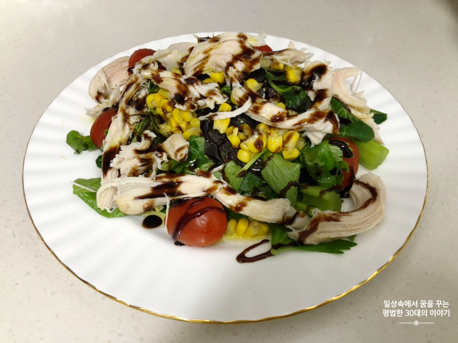 닭가슴살 샐러드 - 닭가슴살, 옥수수콘, 방울토마토, 샐러드 야채, 샐러리, 발사믹 소스, 올리브 오일